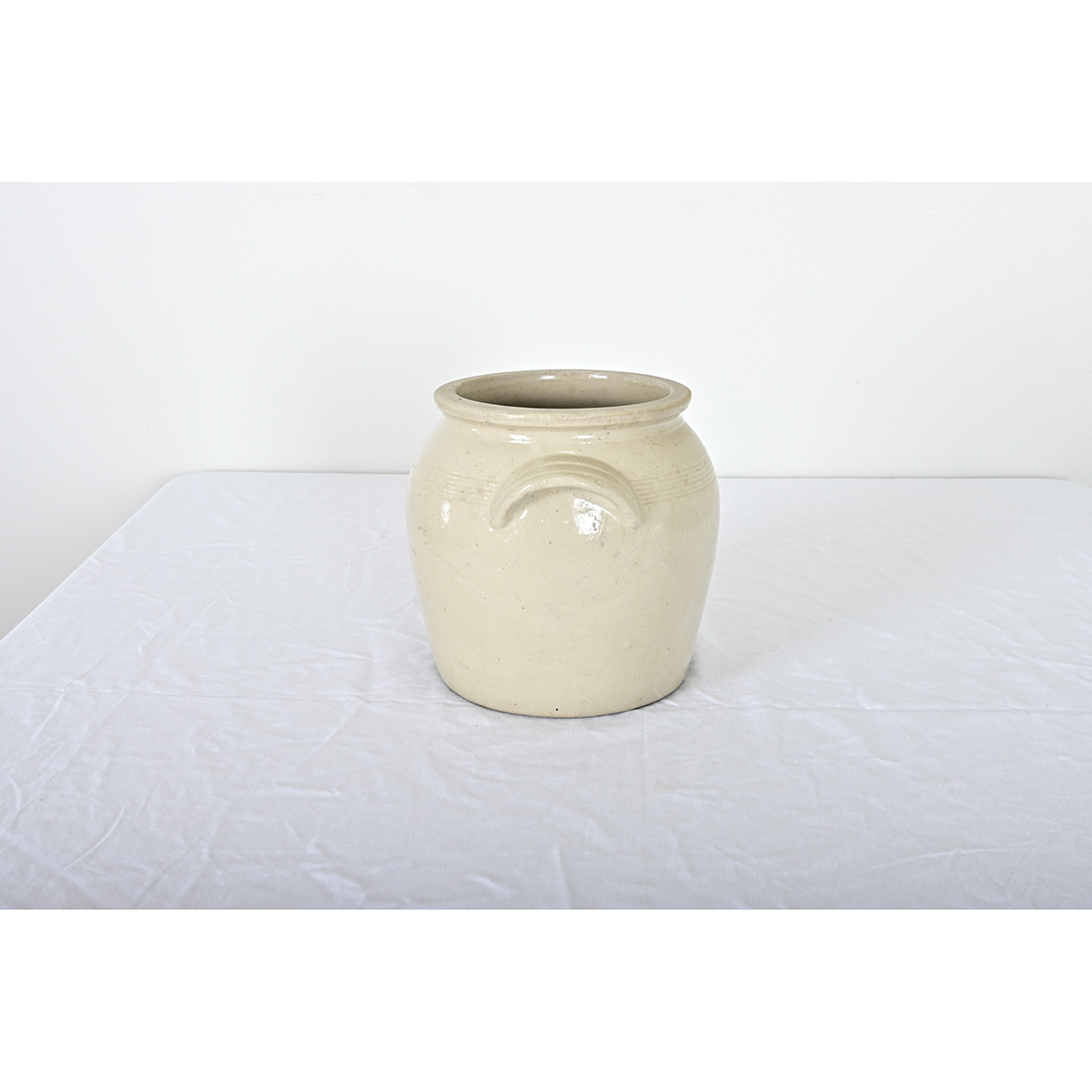 French Provincial 20th century off-white glazed stoneware double handled crock or storage jar. This charming vessel would bring farmhouse authenticity to the modern kitchen by its rustic form and handmade construction with combed, decorative rings around the shoulder. Solid and sturdy for displaying cooking utensils on a counter or greenery like houseplants and dried arrangements. Condition as expected for age and type of use, with crazing of the glaze. Please view the detailed images to see more.