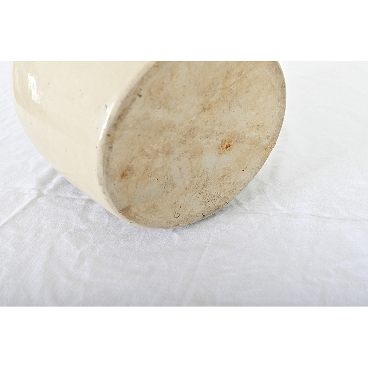 A lovely glazed terra cotta cream bowl from early to mid-20th century France. This earthen bowl–also known as a pancheon–was used to stand milk while the cream separates, then the cream is then poured off the top bythe small spout found on the pot’s lip. This antique bowl is in excellent condition, appropriately glazed a translucent chalk-white on the interior and a soft matte exterior. The glaze was not only a decorative choice but prevented the milk from being absorbed by the terra cotta. Today, this wonderful bowl would make a fantastic fruit bowl or decorative object around the home. Please view the detailed images to see the current condition.