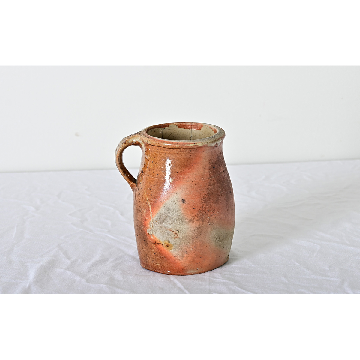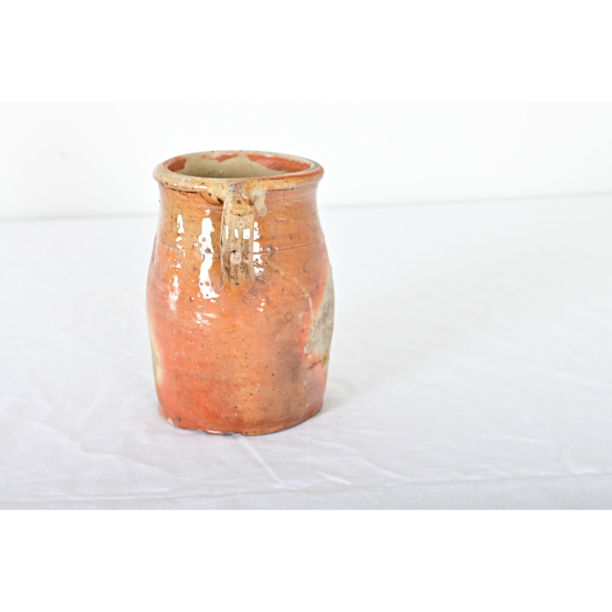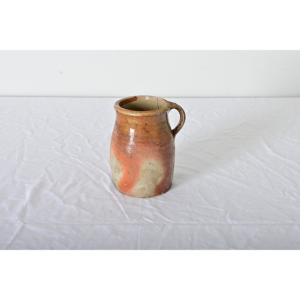 A French vintage “pyrite glaze” confit-type of jar (or pot) with just a single handle, this utilitarian Provincial vessel would have been used to store foods like confit, dairy, or mustard as there isn’t a defined spout for pouring and serving. A unique work of ceramic art on its own, the wabi-sabi organic quality of the jug in brown and neutral glazes lends historic authenticity to any interior for storing utensils in a kitchen to displaying greenery & flowers. Please view the detailed images to see the current condition as there is a long crack toward the front.