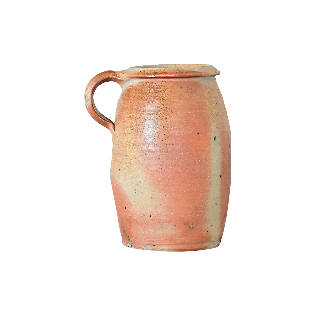 An enormous French 19th century stoneware cruche traditionally used as a bottle or demijohn to transport and store water, oil, or wine. The hand of the potter has imparted organic variation to the form with a wabi-sabi quality of utilitarian authenticity, using a salt glaze which creates movement across the (uneven) surface of the bottle in dramatic shifts of color from deep, earthy browns and reds to the neutral tan of the stoneware clay. The bulbous vessel uses a single handle to aid in pouring liquid out of the narrow mouth at the top that would have been corked. For the modern interior this work of ceramic art is a wonderful artifact of culinary history to add to one’s collection or kitchen décor. Please view the detailed images to see the current condition.