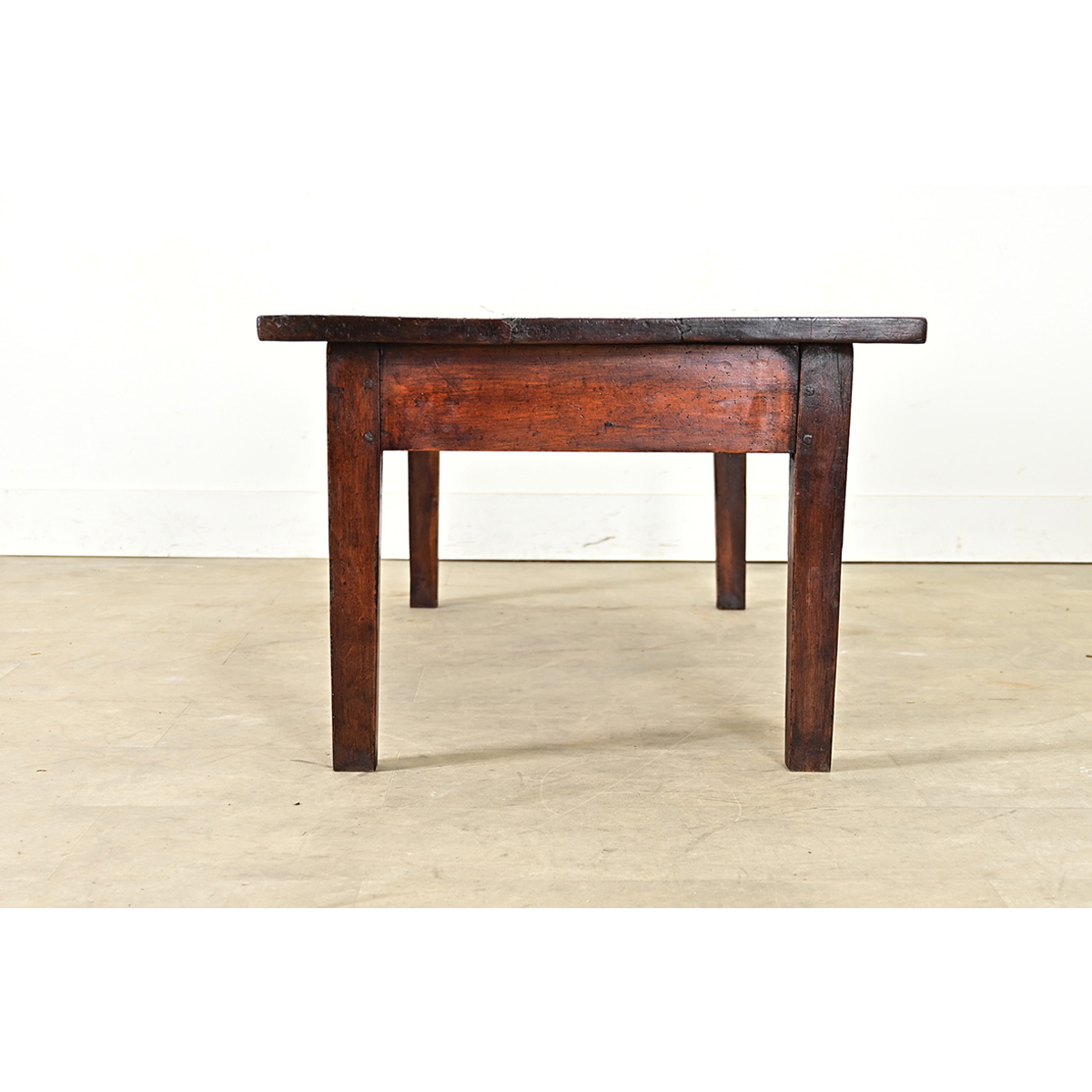 French 19th century farmhouse (dining) table, circa 1840, recently adapted for use as a coffee table to recontextualize the familiarity of a humble farm table placing that sense of warmth and welcome in a living area. Handmade from walnut, the planks of the top feature handsome grain patterns which commingle with the visible square peg joinery and patina from over a century of use. Within the apron is a rather wide drawer for convenient but out of sight storage, opened by a small turned knob. Cleaned and polished with a paste wax, this antique occasional table is ready for its new home. Be sure to view the detailed images to see the current condition.