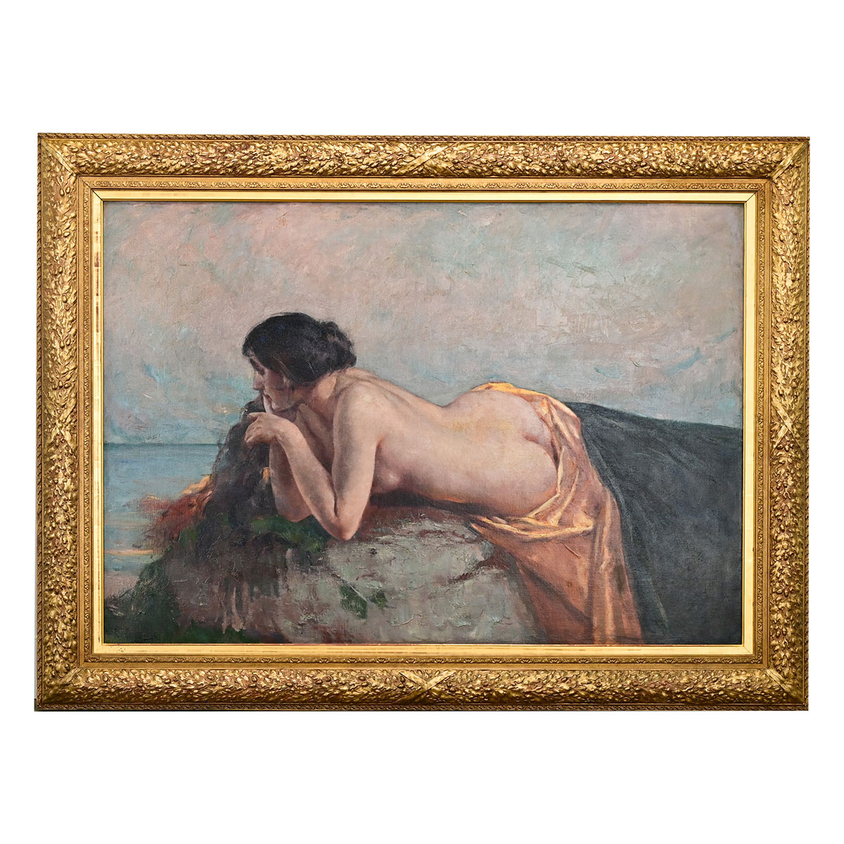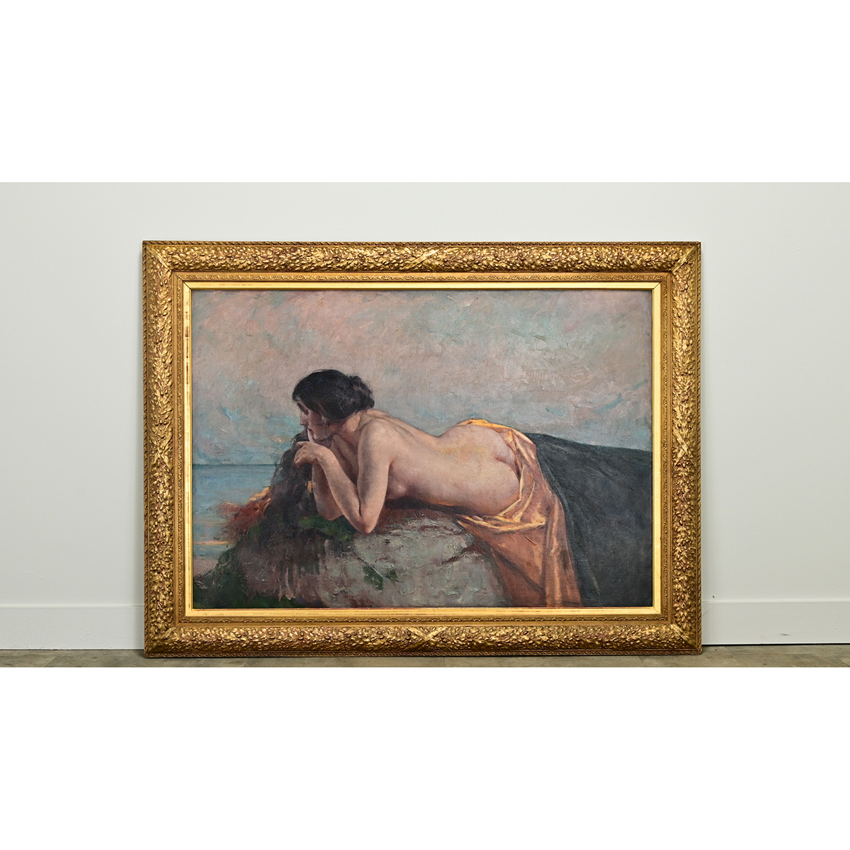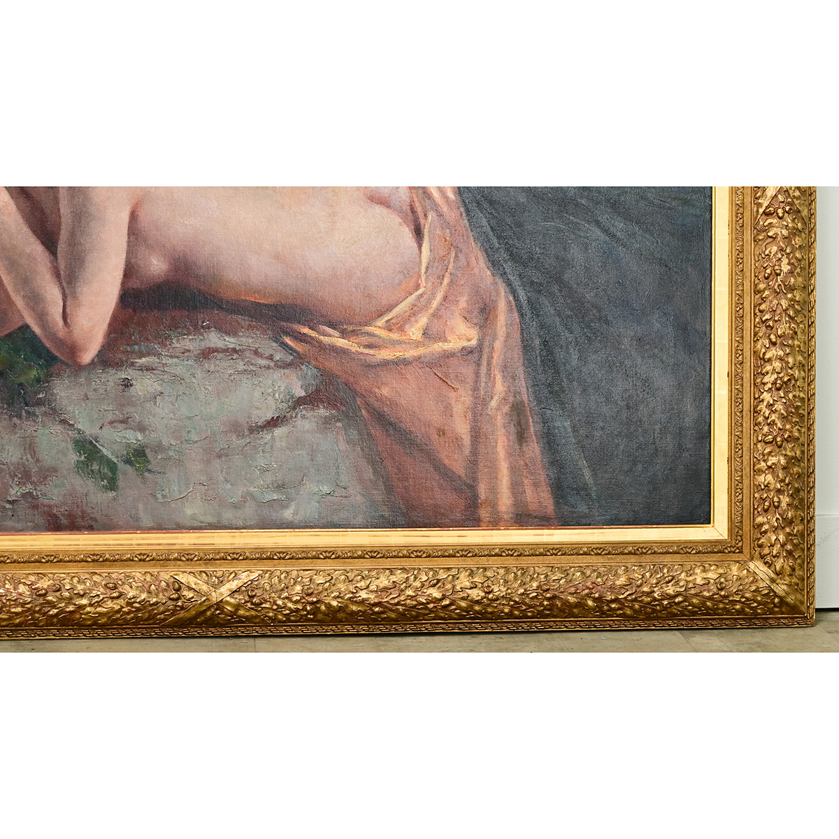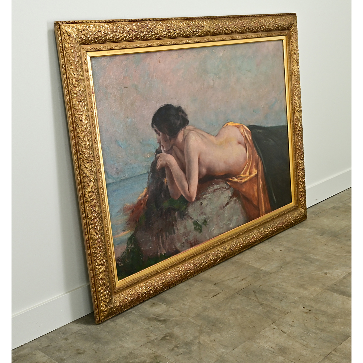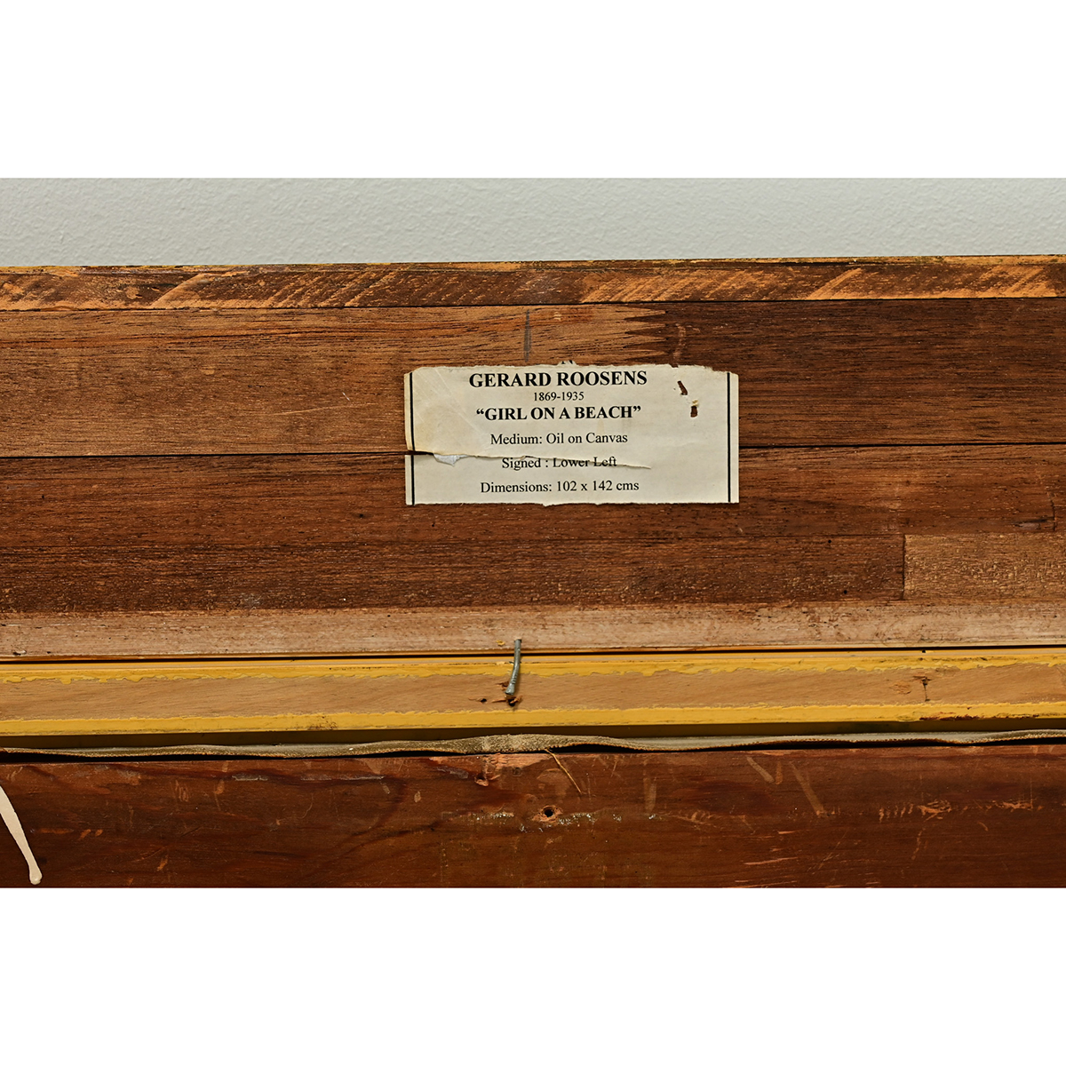 A large scale framed painting by Belgian Artist, Gerard Roosens 1869 – 1935. Entitled “Girl on a Beach” is signed by the artist. The oil painting is on canvas and is surrounded by a museum quality carved and gold gilt frame. Be sure to view the detailed images to get a closer look of its current condition.