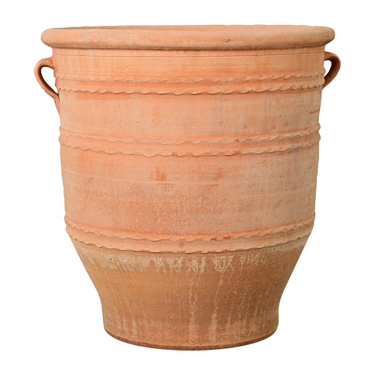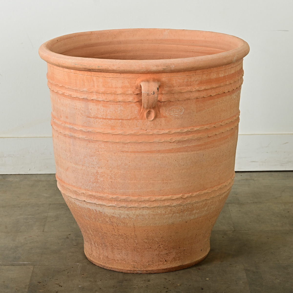 Greek reproduction terracotta pot, or planter, made on the island of Crete using centuries if not millennia-old techniques to achieve their specialized forms decorated with a ringed motif of twisting ribbons. Based on ancient Minoan storage pottery traditionally used as a container for wines, oils, and grains in Greece and around the Aegean. Today, these vessels bring a timeless presence to your interior or outdoor spaces. Please view the detailed images.