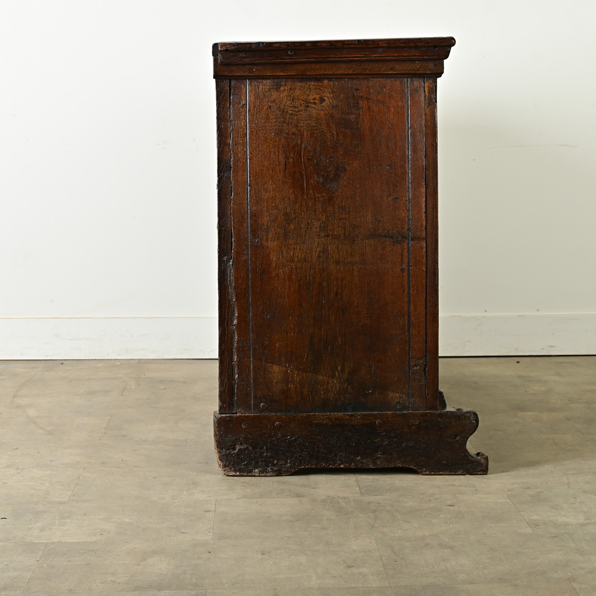 An Italian solid oak sideboard, circa 1780, exhibiting dramatic carvings and depth of color that will have undeniable magnitude in any room. The buffet has a very tactile surface, the planks still display the ripples from having been milled by hand, and pieced together with wood dowels. On the front of the case, two doors and three pilasters exhibit distinctly carved motifs in architectural and foliate inspired shapes. Behind the doors, which close with a carved wood latch, is a compartment with a single shelf, 16 ¾” deep. This heavy and solid oak sideboard is set upon a pair of sled legs at either side that protrude as bracket-style front feet, raising the piece off the floor. The dark, smooth wood has been cleaned and polished with a French paste wax to reveal every historic detail gained over the past three centuries. Please view the additional images for further detail on the piece.