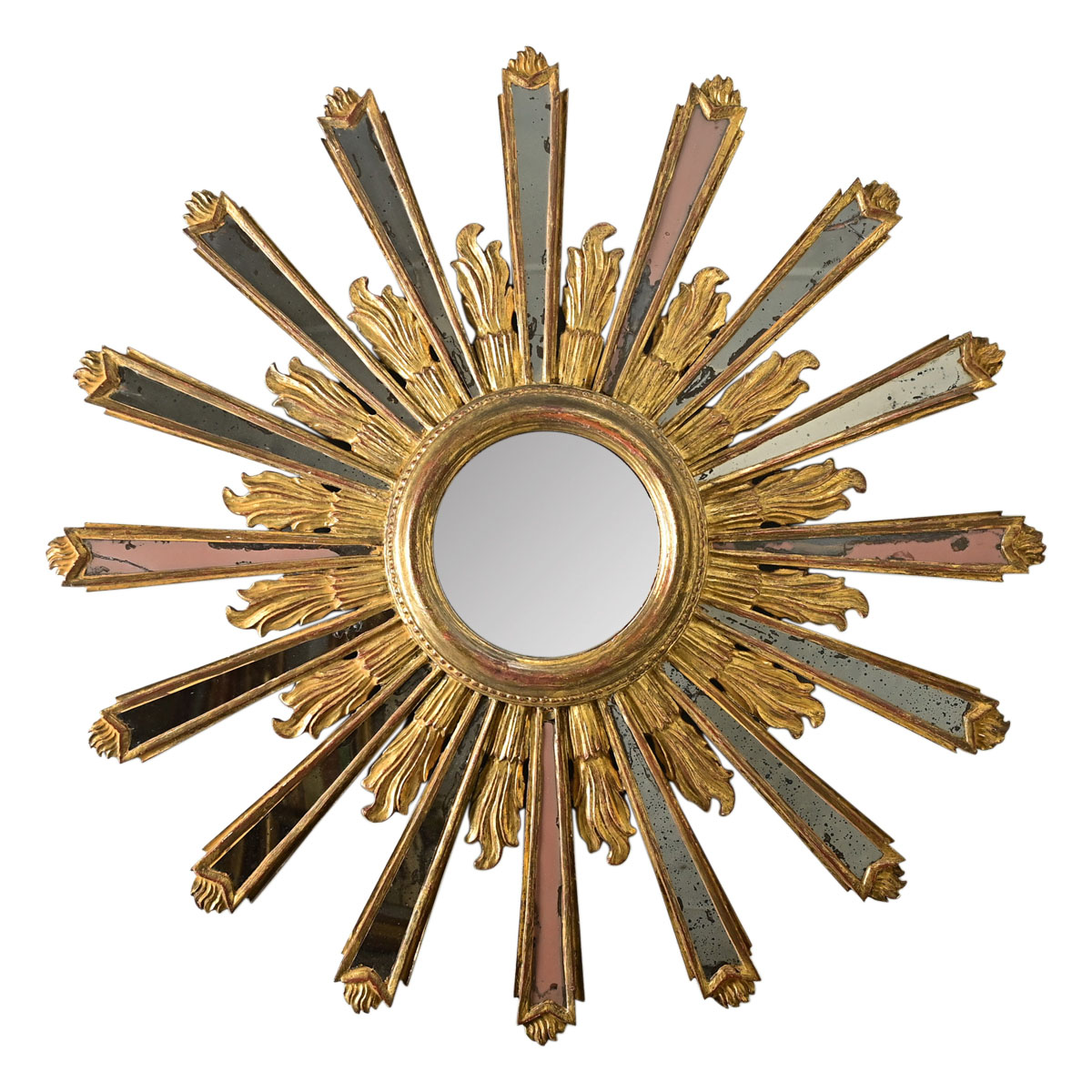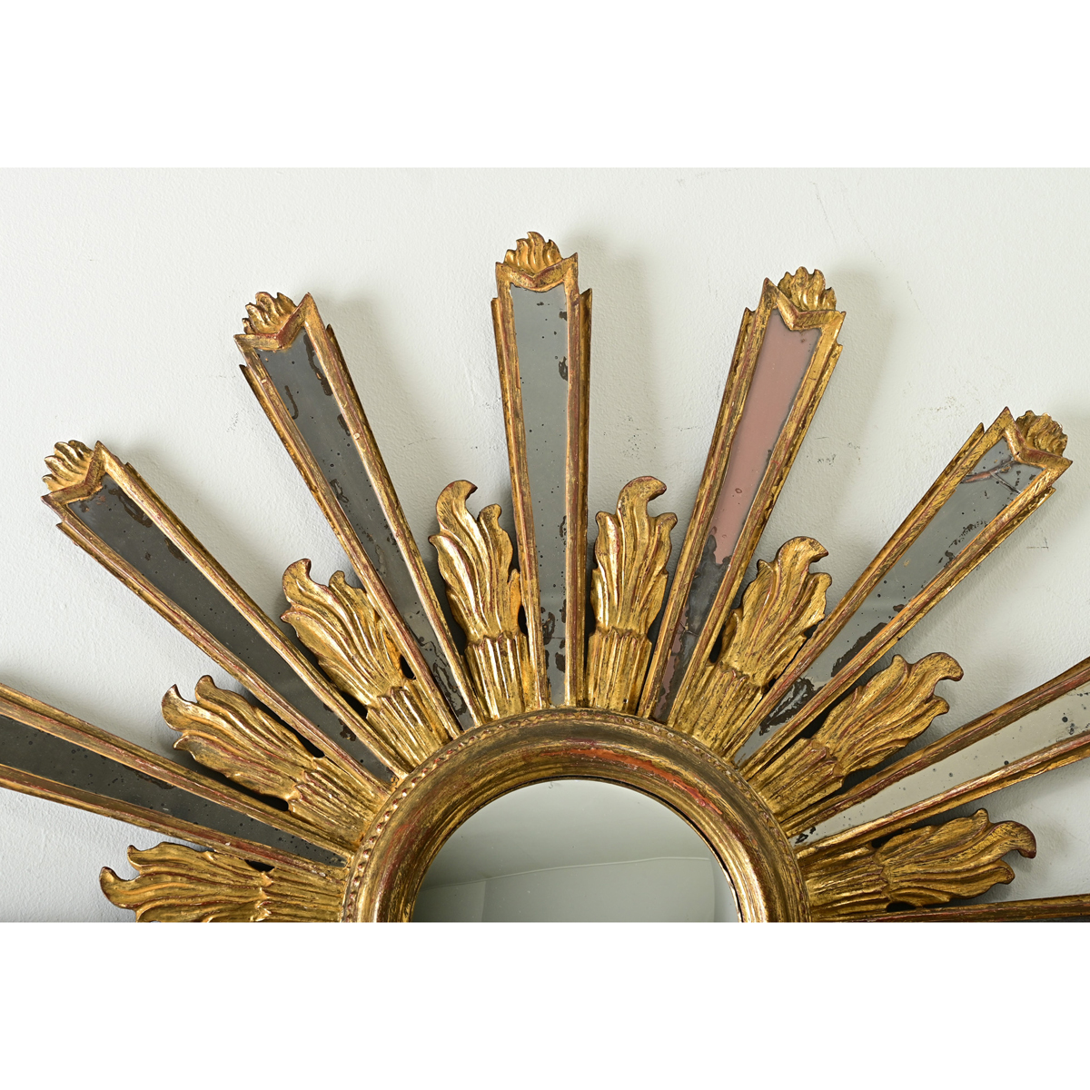 19th century Italian starburst mirror with alternating solar rays of mirror glass and carved gilt wood flames that radiates energy while drawing the viewer in for a closer look. Each narrow sliver of mirror plate within the longest rays has varying degrees of foxing and opaque color, matched by the tactile warmth of the patinated gold gilt corona surrounding the (original) convex mirror plate at center. Please view the detailed images to see the current condition.