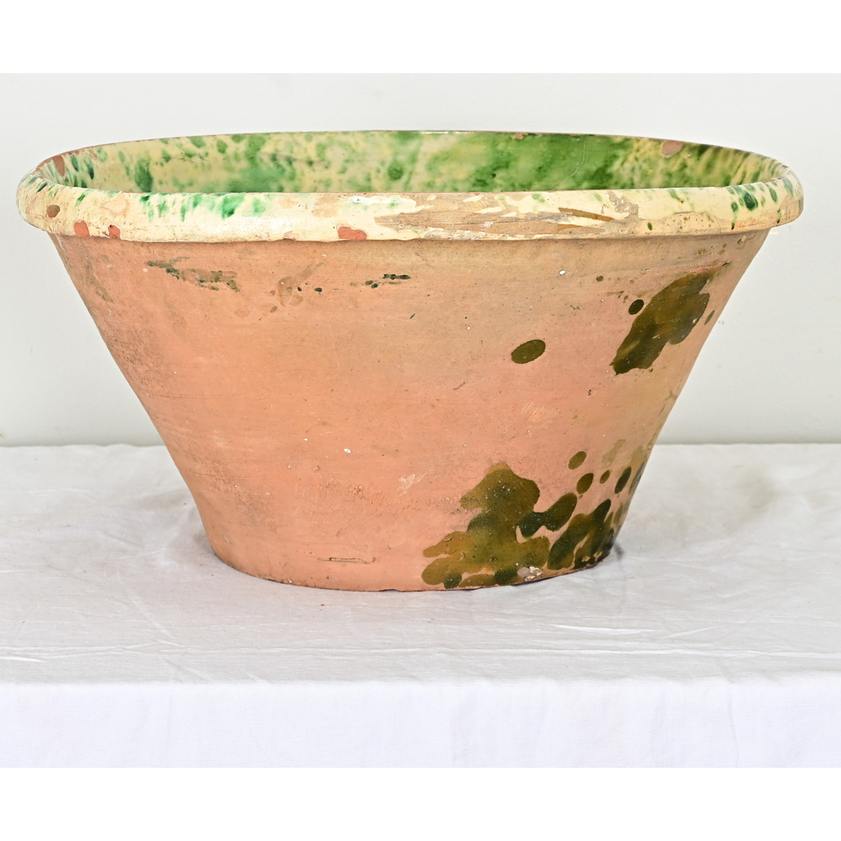 A painterly passata bowl from the Puglia region of Italy, 19th century. The large terracotta bowl features a glaze in spongeware effect of bright green over a buttery yellow slip on the inside and is animated by dark green patches on the exterior. This vessel would have been used in peak tomato season to make fresh sauce in large quantities. In charming antique condition, a conversation piece to display or use for light duty storage. Please view the detailed images to see the current condition.