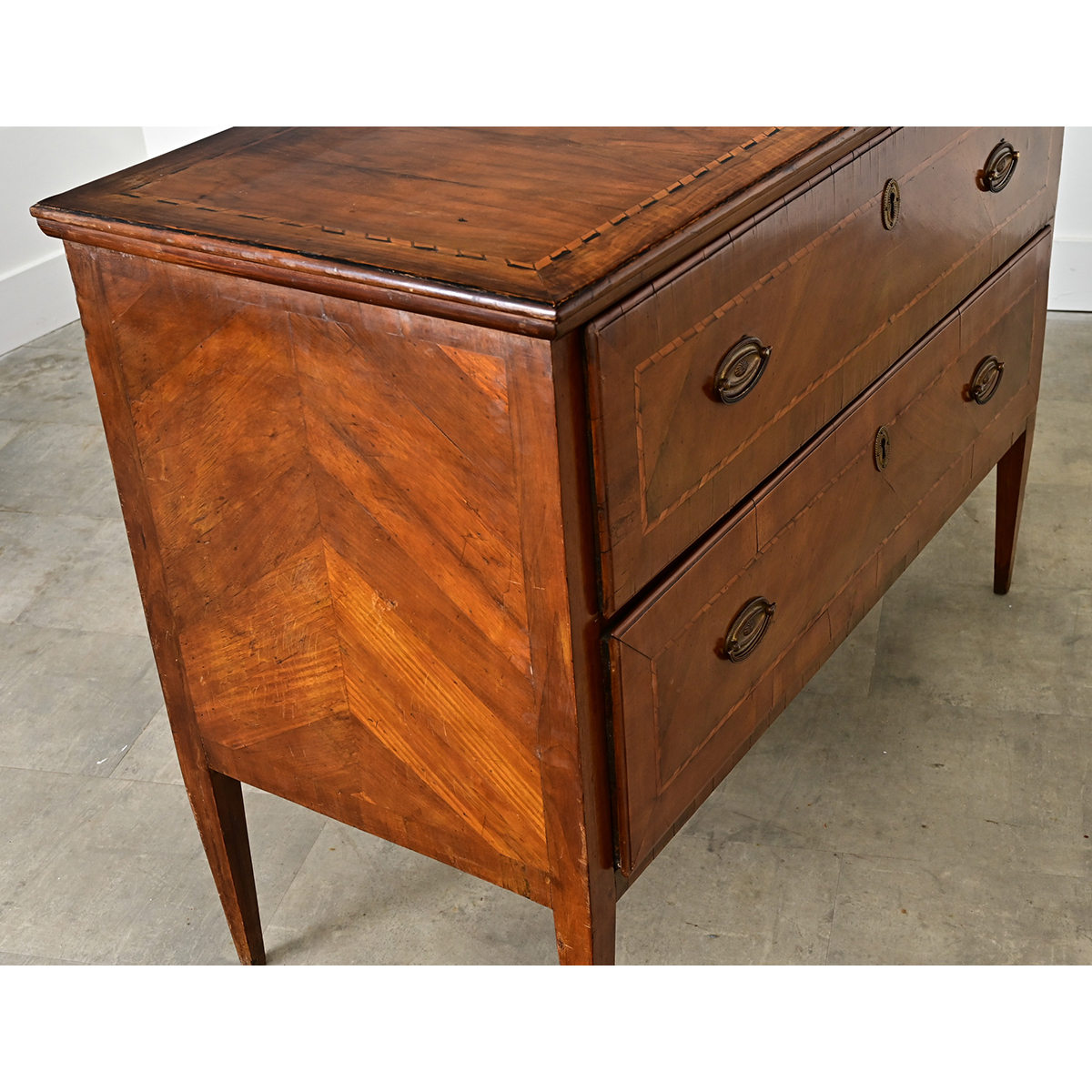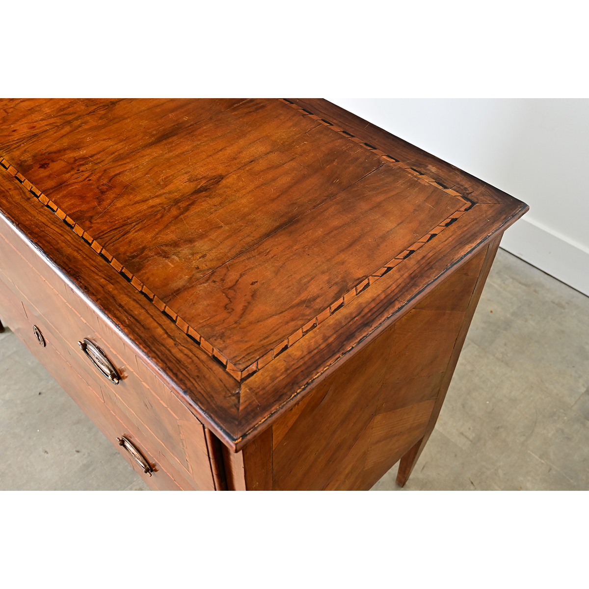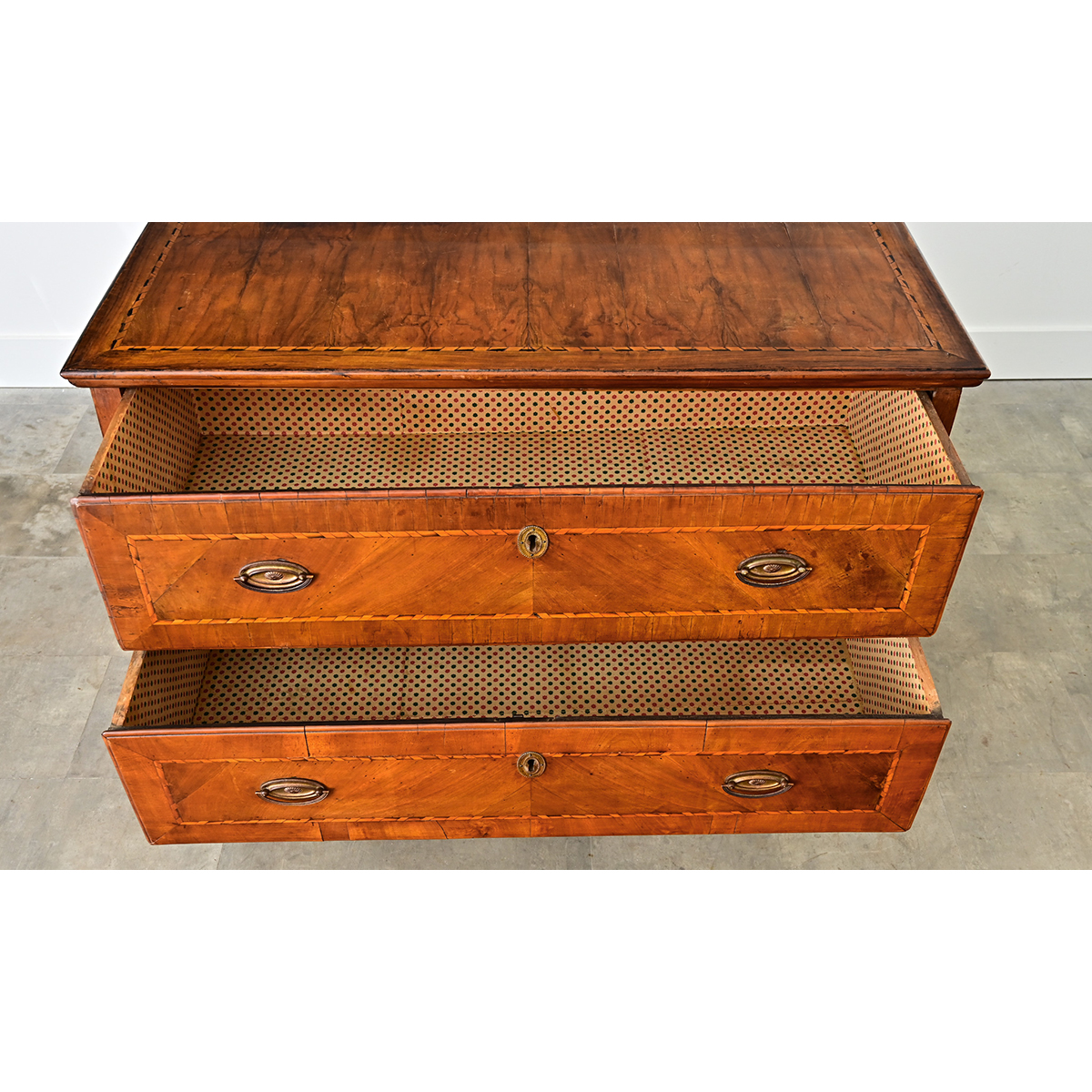 This Italian chest of drawers from the 19th century, in its wide, rectilinear proportions becomes a showcase for the walnut construction with thin bands of marquetry to complement the movement in the grain. The top surface is arranged as parallel strips in the center panel enclosed by a line of inlay like a twisted rope, framed by a border around the four sides. The sides of the case and drawers feature bookmatched, chevron fronts leading the eye upward, repeating the same rope twist line and opening by oval brass ring pulls. Two spacious drawers easily glide to reveal a clean interior, lined in charming vintage green and red daisy-patterned paper. Square, tapering legs elevate the case from the floor. Departing from the standard three row commodes in the French tradition, this example has a modern sophistication that will appeal to collectors of 20th century design as well. Cleaned, tightened and polished with a French paste wax, this chest of drawers is ready for your interior. Please view the detailed images as they are essential to understanding the current condition of the antique.