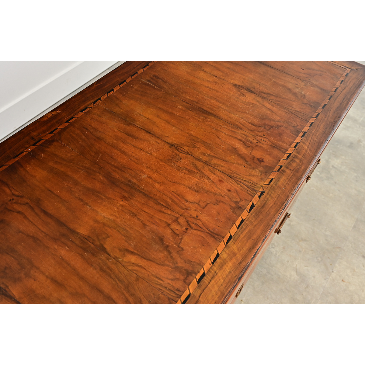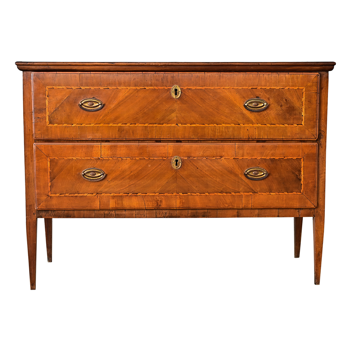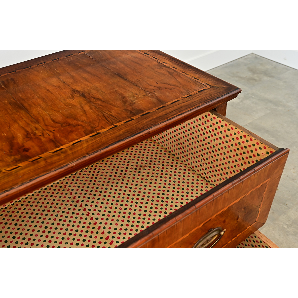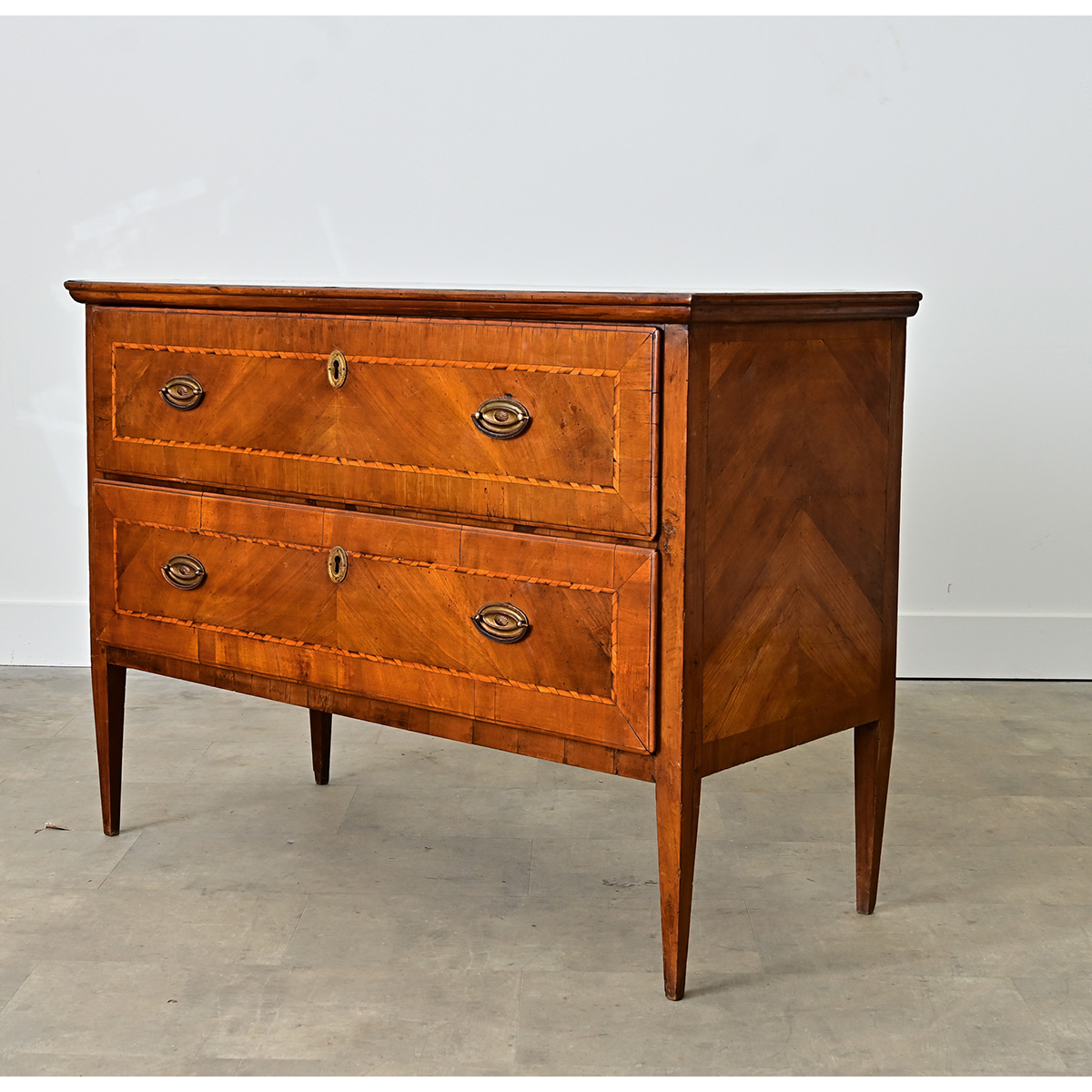 This Italian chest of drawers from the 19th century, in its wide, rectilinear proportions becomes a showcase for the walnut construction with thin bands of marquetry to complement the movement in the grain. The top surface is arranged as parallel strips in the center panel enclosed by a line of inlay like a twisted rope, framed by a border around the four sides. The sides of the case and drawers feature bookmatched, chevron fronts leading the eye upward, repeating the same rope twist line and opening by oval brass ring pulls. Two spacious drawers easily glide to reveal a clean interior, lined in charming vintage green and red daisy-patterned paper. Square, tapering legs elevate the case from the floor. Departing from the standard three row commodes in the French tradition, this example has a modern sophistication that will appeal to collectors of 20th century design as well. Cleaned, tightened and polished with a French paste wax, this chest of drawers is ready for your interior. Please view the detailed images as they are essential to understanding the current condition of the antique.