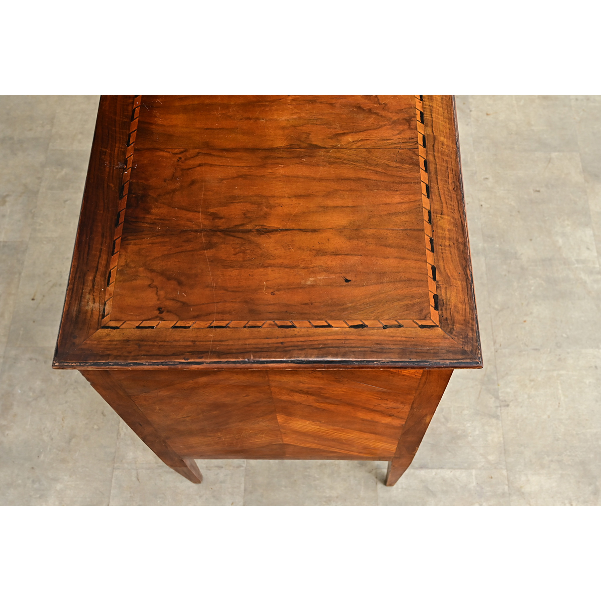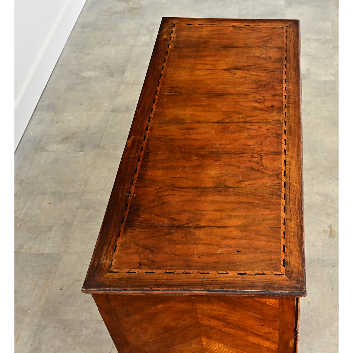 An extraordinary Italian walnut commode from the 19th century, Neoclassical in style, decorated with a graphic marquetry of dark/light woods that creates movement and definition over the exterior. The surface uses two, beautiful planks shaped to chamfered corners and outlined around the edges with a sawtooth pattern of inlay in contrasting light/dark tones. A case of five drawers includes two small drawers in the top row over three wider drawers all inlaid with a geometric design of elongated checkerboard strips of alternating blonde and dark woods. Each drawer opens by ring pull hardware; note the escutcheons are only decorative without an original key present. Chamfered front corners are inlaid with a very narrow triangle rising from the feet to end in a little diamond perhaps suggesting a candle or symbolizing an eternal flame. The side panels have inlaid designs complementary to those on the drawer fronts so from every perspective one can admire the visionary intentions of the maker even two centuries later. Cleaned and polished with a French paste wax, this commode is ready to be enjoyed in your interior. Be sure to view the detailed images to see the current condition.