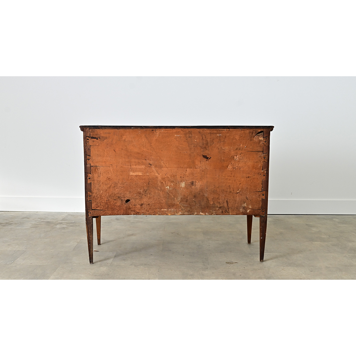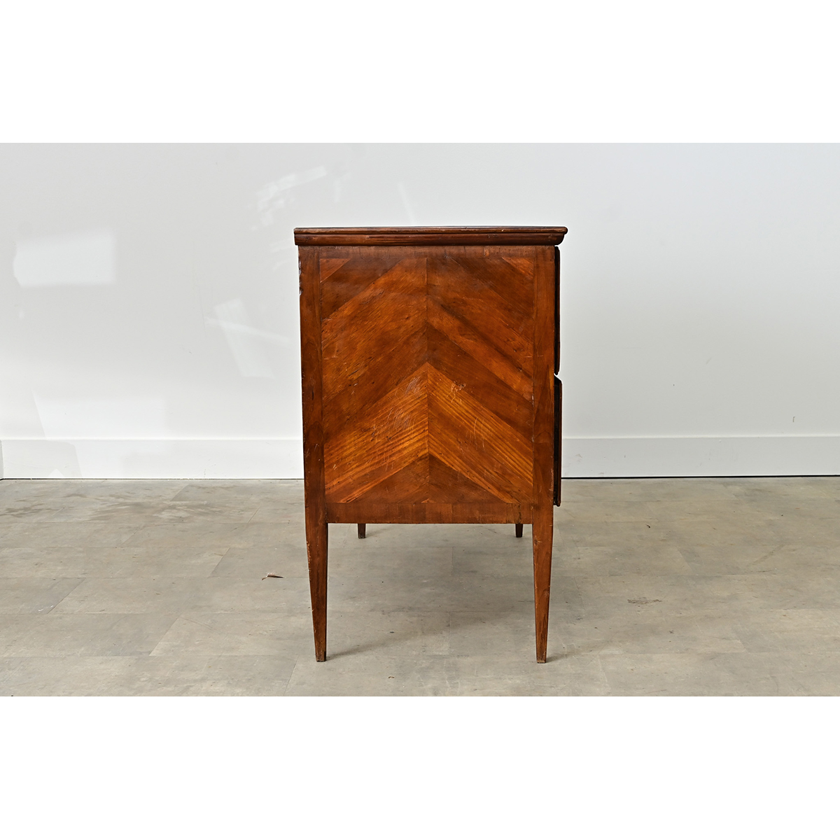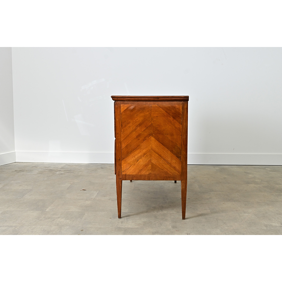 An extraordinary French mahogany commode from the 18th century, Louis XVI Period, decorated with an impressive marquetry technique that creates movement and definition over the drawer fronts and side panels. The commode retains its original slab of gray marble, the surface animated by frenetic white veining, and shaped to turreted front corners. Across the top row are three drawers of geometric marquetry designs to outline them–like two rows of twisting ribbon–in alternating blonde and dark woods. Brass bail pulls operate the left and right drawers while the middle drawer requires the key to function as a pull (lock is intact but does not turn). The two wide drawers across the center and below, follow the rhythm as above with three distinct rectangular “frames” around the drawer hardware, in graphic marquetry of dark/light woods that have been hand-decorated in wispy patterns of red pigment suggesting plumes or waves–adding depth and regal grandeur to this already fine example of the woodworker’s craft. The side panels have complementary inlaid designs, themes which are replicated down the turrets (using marquetry to imply fluted recesses) moving into the conical feet so from every perspective one can admire the visionary intentions of the maker even two centuries later. Cleaned and polished with a French paste wax, this commode is ready to be enjoyed in your interior. Be sure to view the detailed images to see the current condition as the right side panel appears to have been repaired.
