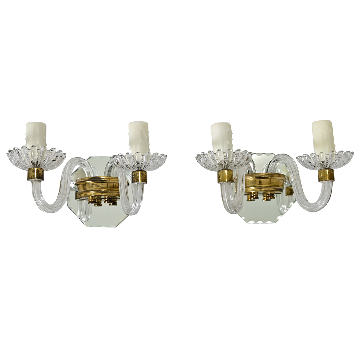 A petite pair of Italian wall sconces from circa 1930 in clear glass, mirror glass, and brass. Each sconce features a pair of arms with faux candle covers for candelabra-base lightbulbs, rising from pressed glass bobeche supported by elegantly curled and fluted arms. The backplates are octagonal plates of mirror glass with Venetian-style cuts along the edge and crescent-shaped brass mounts where the arms connect. The reflectivity of these striking fixtures will delight in a bathroom or hallway. Cleaned and professionally rewired to US electrical standards using UL-listed parts, ready to install in your interior. Please view the detailed images. Sold as a pair.