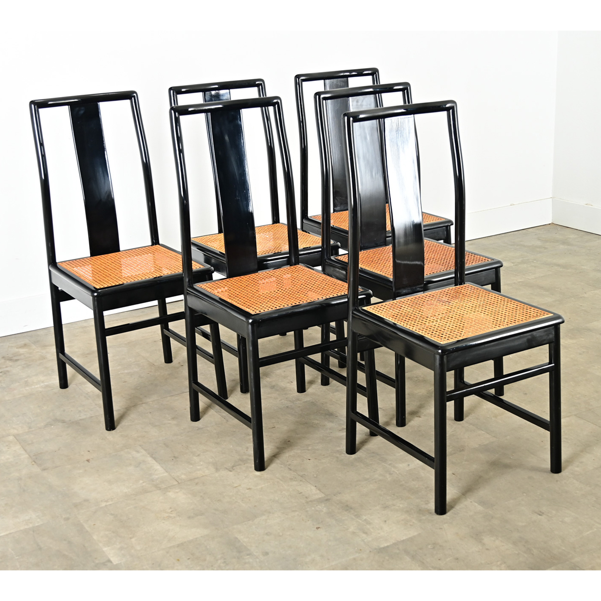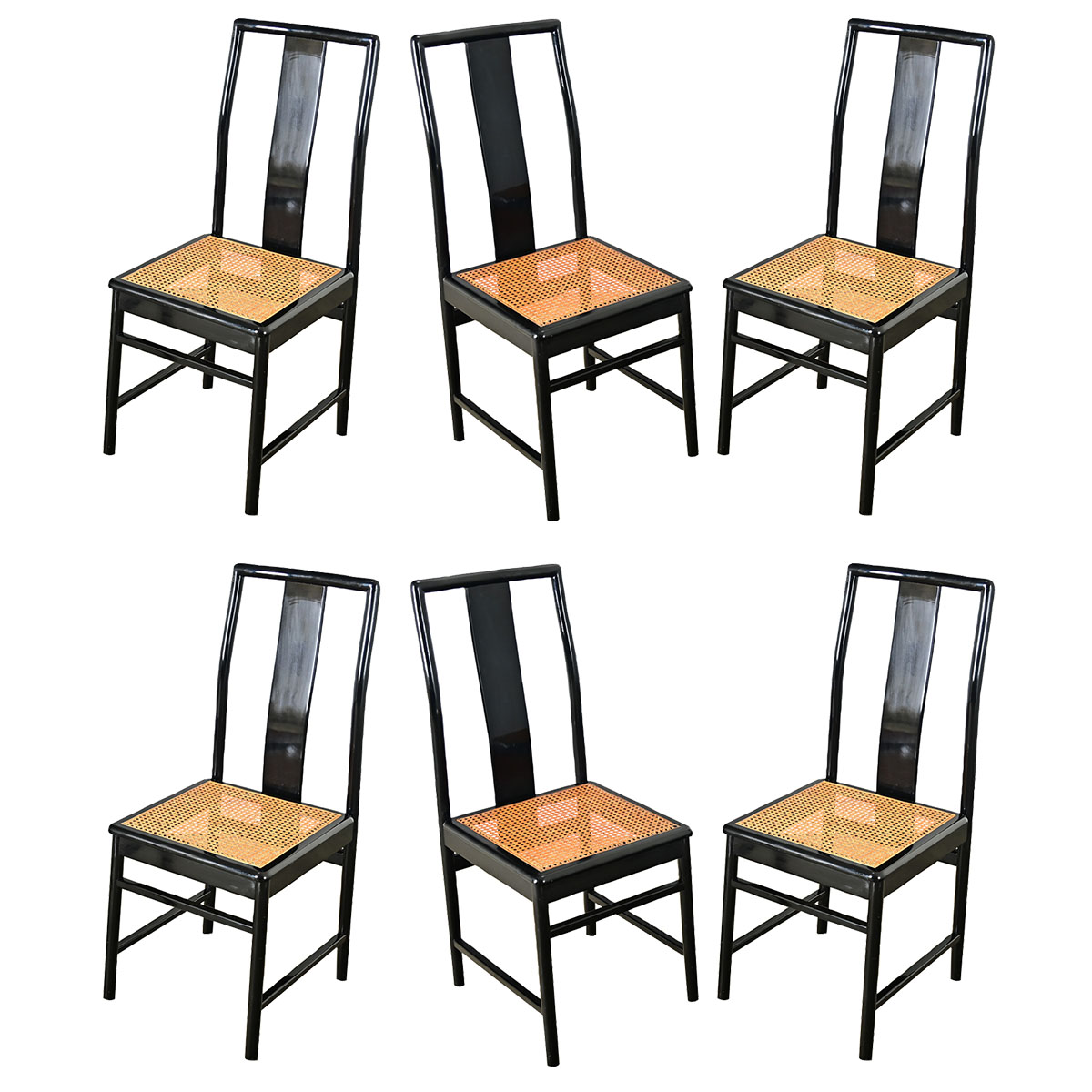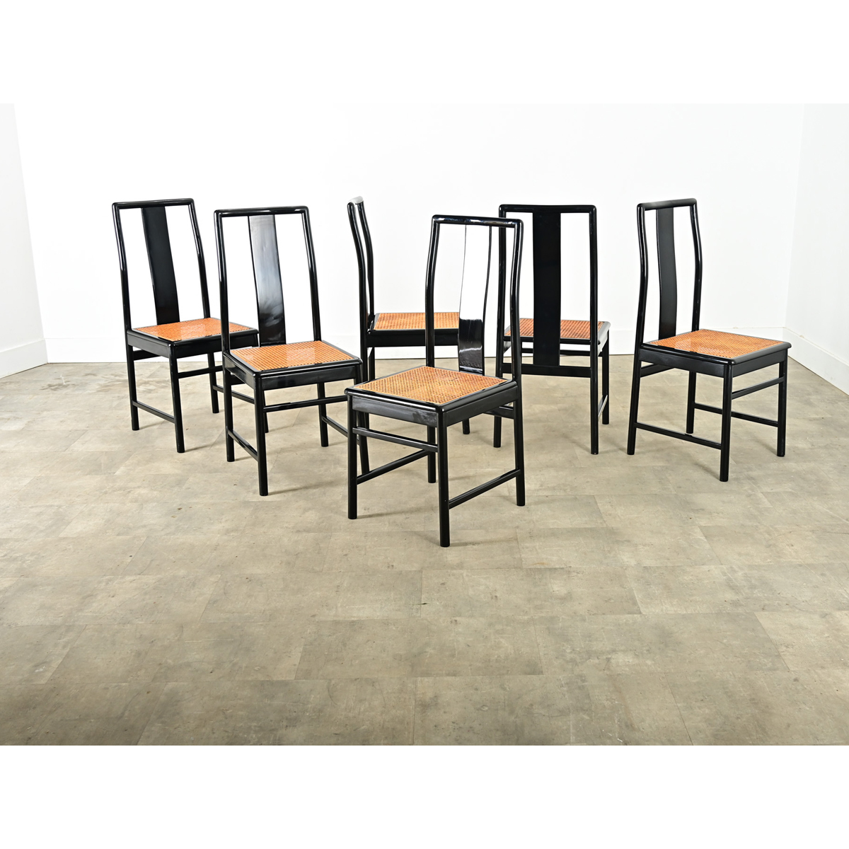 Fabulous set of six vintage Italian-made dining chairs with black lacquer frames and woven cane seats for a modern yet timeless look. Inspired by the formality of Chinese Ming style, these distinctive chairs appear to be the work of Italian firm, Fratelli Montina, who also produced designs by the architect Gio Ponti. Slick, black lacquer coats the wood frames, emphasizing the linear and vertical qualities of the design, sharply contrasted by the woven cane seats in their natural straw color. Wear is consistent with age and use, cleaned and polished to maintain the sheen of the lacquer. Please view the detailed images to see more. Sold as a set of six.