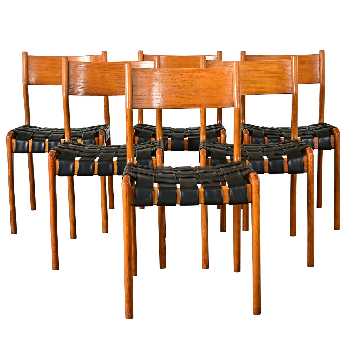 A timeless set of six armless dining chairs by the Italian firm Consorzio Sedie Friuli, circa 1960, in beech wood frames with woven seats in thick leather straps. Classic midcentury modern, the set nods to iconic Danish or other sleek Scandinavian designs and will pair well with contemporary and curated interiors of today. The beech frames glow with an amber hue, contrasting with the wide, black leather straps of the seat, still remarkably tight for the age. Cleaned and polished with a French paste wax they are ready for your interior. Please view the detailed images. Sold as a set of six.