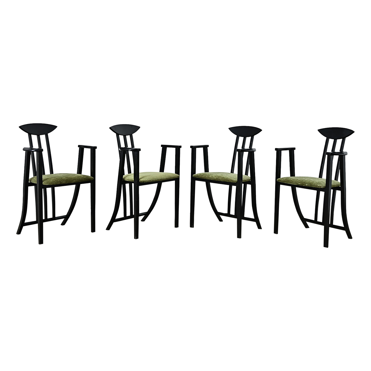 A very unusual set of four dining armchairs from Italy–1980s, the height of Postmodern and Memphis design– with stylistic references that go back to the late 19th century. The influence of Charles Rennie Mackintosh is undeniable as the chairs are stylized, even architectural in their simplification of distinct geometric lines made even more pronounced by the sturdiness of the ebonized frames. At the top of the chairs is a crescent-shaped headrest narrowing to sharp points, rising from the splat of three parallel bars set at a comfortable recline behind the upholstered seats (currently in a sage-green chenille). Vertical legs at the front and sabered legs at the back are sturdy, rising up to half-moon armrests. The openness of the design and the bold creativity invites a conversation whether placed around a dining table or a living room arrangement. Gently cleaned and polished, ready for your interior. Please view the detailed images as they are an essential to the product description. Sold as a set of four only.