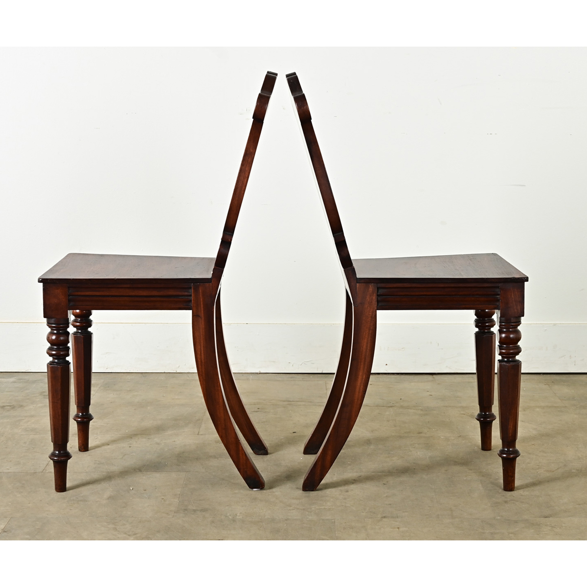 Stunning pair of Regency hall chairs from England, circa 1800. Dramatic in color alone, the solid mahogany planks lend themselves well to carved, scrolling details in the shield-back seats. In the center of the back, a heraldic device in the form of a small vignette in polychrome depicts a wild-eyed horned goat after being shot through the heart with an arrow. Flat seats rest on two turned legs at front and plain, saber legs at the back. View the detailed images. Sold as a pair.