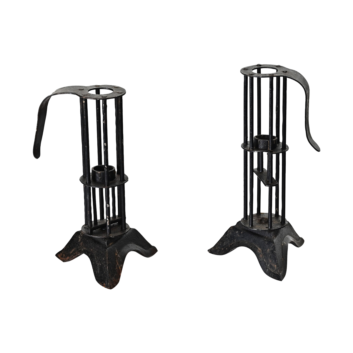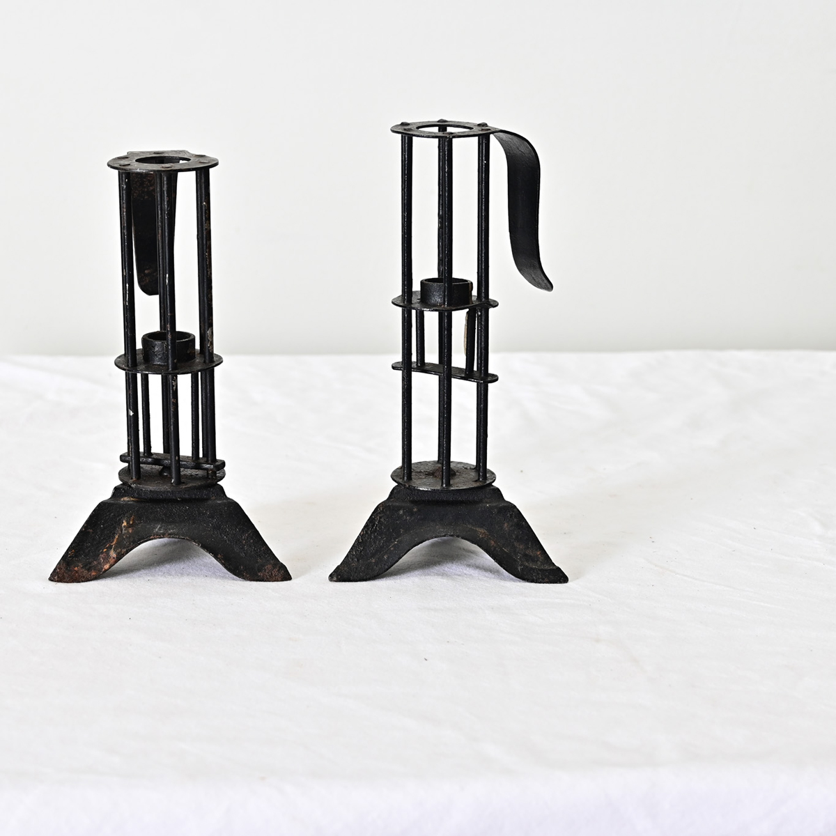 French 19th century (or earlier) forged iron carriers for a taper candle within a small cage. Extending from the rods at the top is a flat handle to safely lift this candlestick contraption and set it out on a table. A triangular, tripod base makes an elegant presentation and the simplicity of the form is part of the intrigue. Removed from its original context the piece could be adapted to many new uses around the home. Please view the detailed images to see the current condition, and note that they differ slightly in height. Sold as a pair.