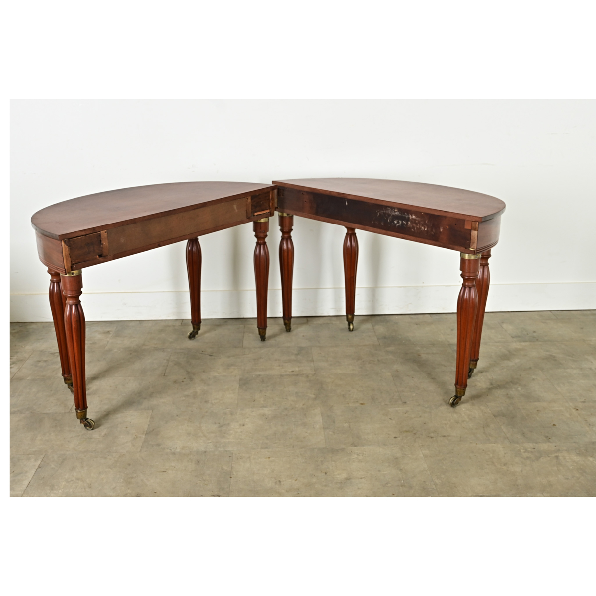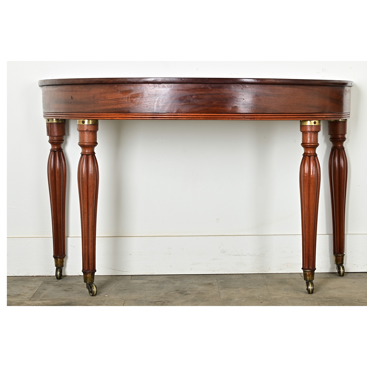 A pair of elegant French mahogany demilune console tables with lovely grain pattern under the expected patina in the tops. Their aprons are accentuated by a reeded edge and are supported by carved, tapering legs on brass casters. Cleaned and polished with a French paste wax, ready to join your interior. Make sure to view the detailed images to see the current condition. Sold as a pair.