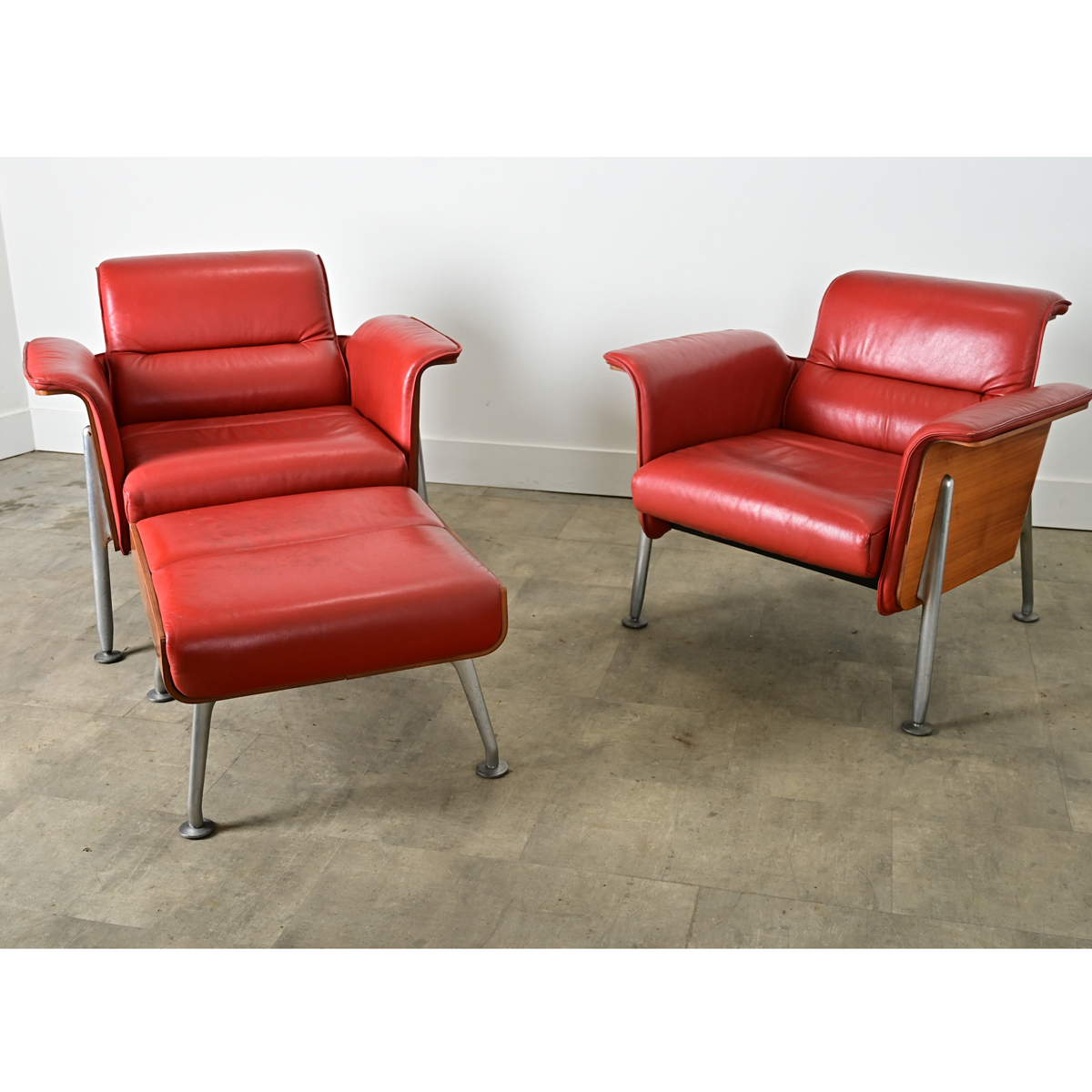 This vibrant seating ensemble from German firm Wilkhahn was designed in the late 20th century by multi-hyphenate designers Wiege, Frenkler, Kolberg & Birkenheuer. The set includes a pair of red leather-upholstered lounge chairs and a matching ottoman to share between them. A molded plywood shell with walnut veneer (nodding to midcentury modern) encloses the cherry red interior of luxurious full-grain leather, elevated by cast aluminum legs. Wide seats are supremely comfortable, benefitting from thoughtfully engineered head and armrests gently folded over the shell for guests to lounge or converse at length in a living room, study, or office. Please view the detailed images to see the current condition as there are some dark spots in the leather. Sold as a set of three pieces.