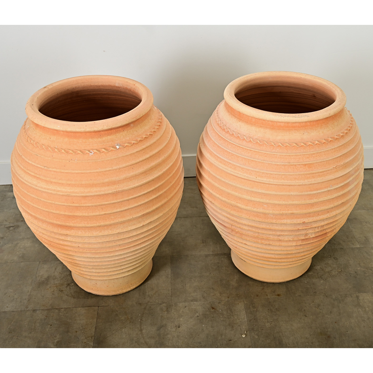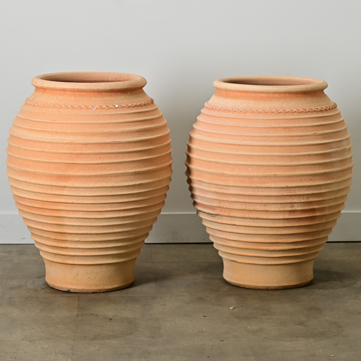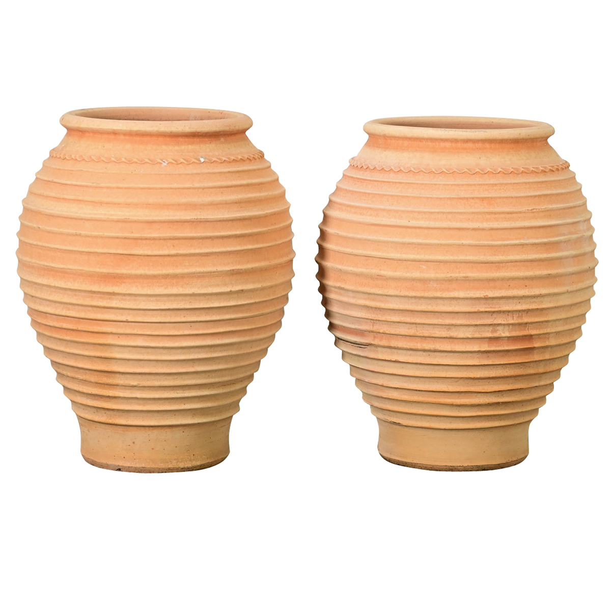 A pair of Greek reproduction plant pots from Crete, made of terracotta resembling the olive jars used around the Mediterranean region since antiquity. These bulbous vessels are nicely decorated with a line of waves below the rim, a chain stitch pattern, and ribbed details encircling the body at equidistant ridges–left unglazed to develop their own unique patina with time and use. Pierced with a drainage hole in the base to use with greenery or flowers on the patio, in the garden, or paired with saucers in your home. Please view the detailed images. Sold as a pair.