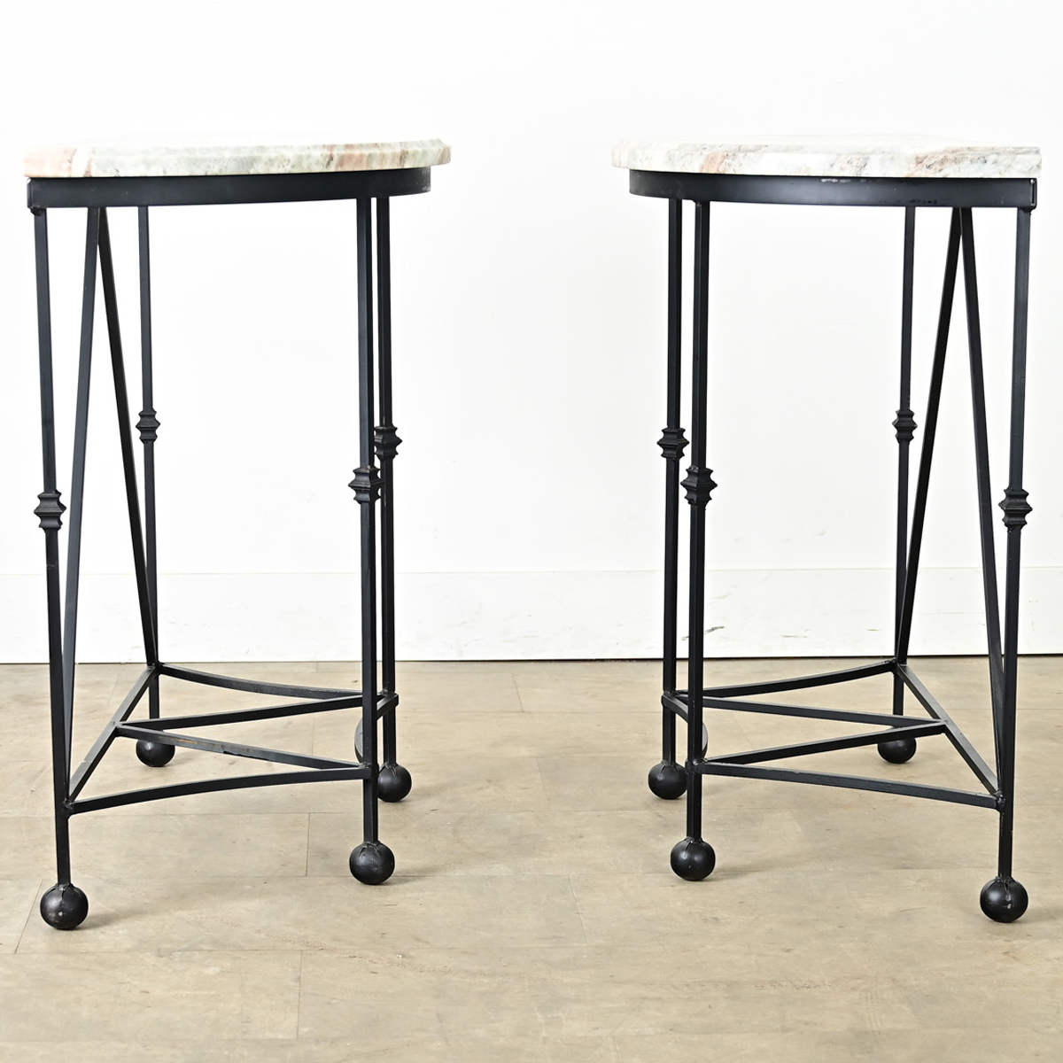 A unique pair of iron and marble demilune console tables, made more recently but with timeless French styling to suit any interior or patio. The half-round marble tops are new, streaked with pastel veining of green and taupe subtly merging with the white stone and finished with a satin sheen keeping the natural texture evident. The four square rods for legs are accented with little, angular stations about halfway down before ending at exaggerated ball feet. A low “shelf” could be adapted for extra storage or display area depending on one’s needs or placement. Please view the detailed images to see more. Sold as a pair.