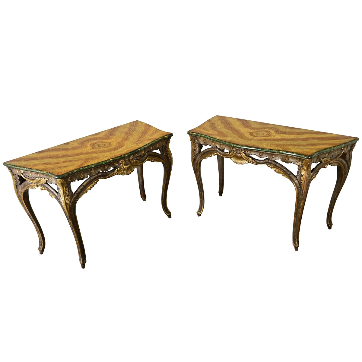 Pair of mesmerizing 19th century Italian painted and giltwood console tables in the rococo style with faux marble tops. Expertly painted, the trompe l’oeil surface captures the exuberant vein patterns of bookmatched onyx or marble, rendered in translucent gold to amber hues with ribbons of white, finished on the edge in a jade green. Below, the swelled apron of the table frame is ornately carved in typical acanthus leaves and fan motif, bathed in gold for a lovely contrast to the dark taupe paint. Elegant cabriole legs echo the serpentine profile for a complete look. Recently cleaned, tightened and restored, please view the detailed images. Sold as a pair.
