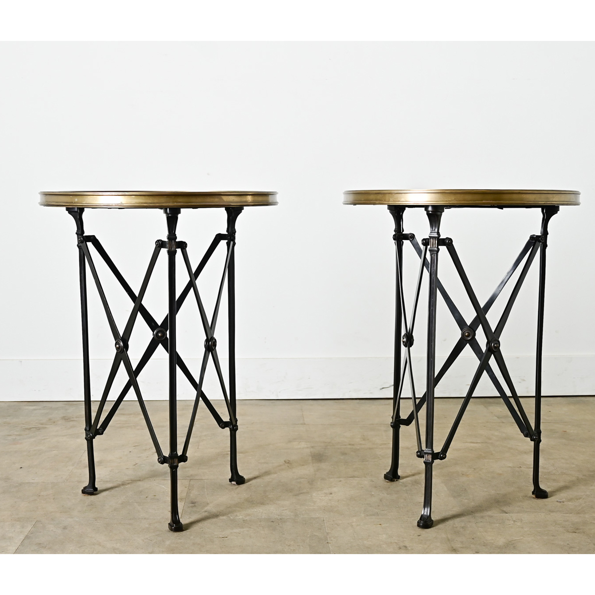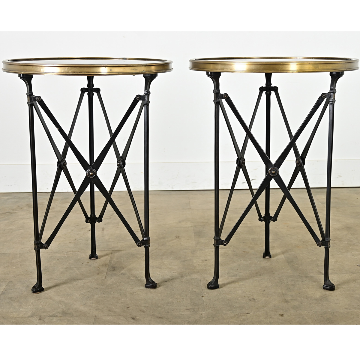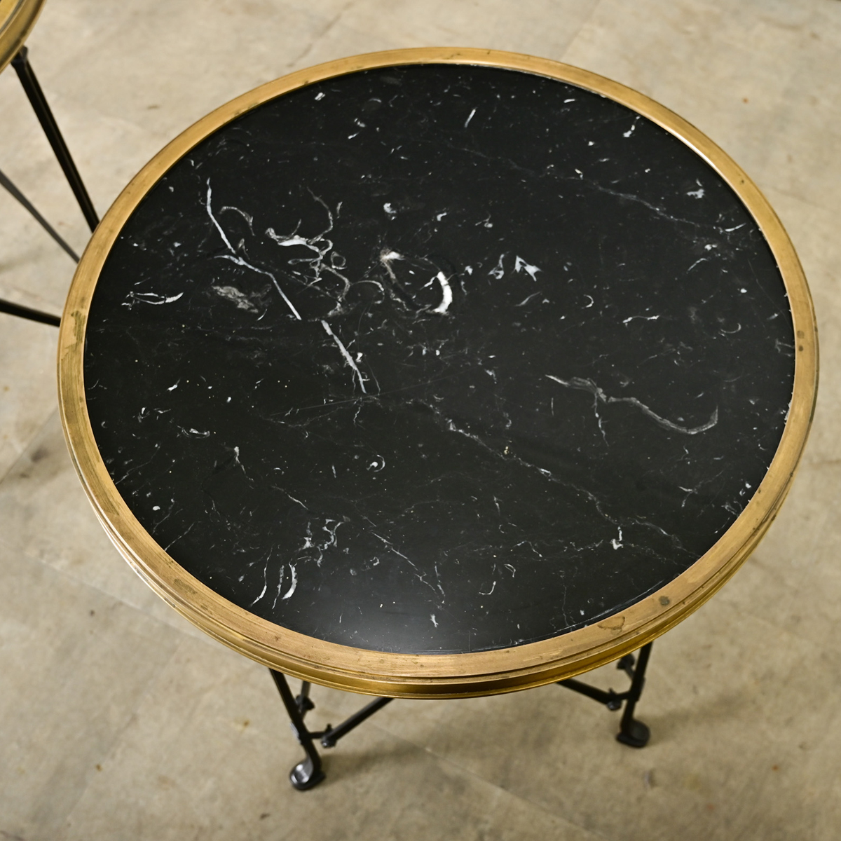 A small yet dramatic pair of French Empire inspired reproduction side tables. Nero Marquina black marble tops are ringed with bronze bezels, supported on blackened steel frames, each with three legs joined by crossed stretchers for a bold look from every angle. Please note the marble does have some etched patina in the surfaces–see the detailed images. Sold as a pair.