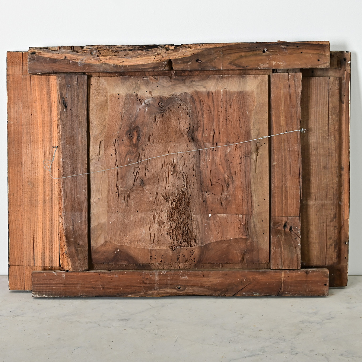 Portuguese 18th century assemblage painting of Christ, likely an architectural fragment or retablo that would have hung in a church. Constructed of thick, wood panels the central vignette features the risen Jesus with right arm outstretched to gesture with three-fingers (for the Holy Trinity) while his left hand holds a red banner against a pastel corona in the background. Four soldiers in the foreground regard him expressing a range of emotions from grief to shock. Flanking the middle scene are two narrow panels entirely handpainted with exquisite geometric designs in more bold saturations of color, resembling Moorish tiles, all outlined in gold gilt. Currently the work is strung with picture wire on the back to hang. Please view the detailed images to see the current condition of this incredible work.