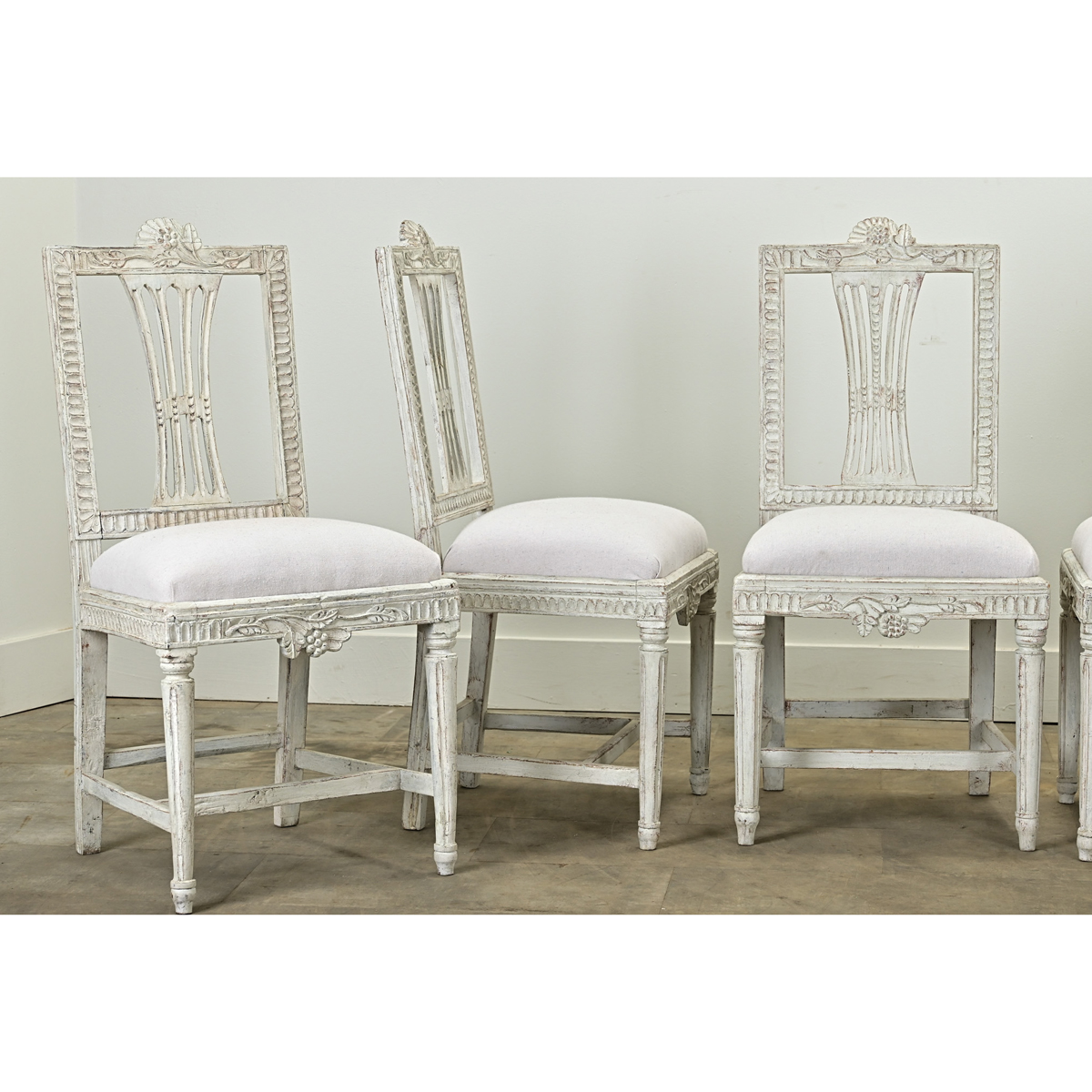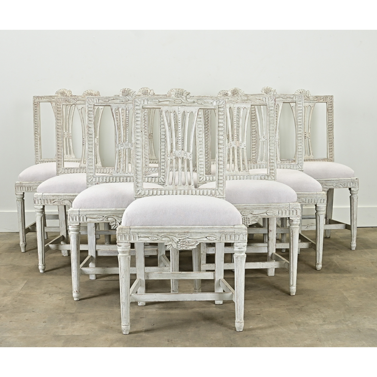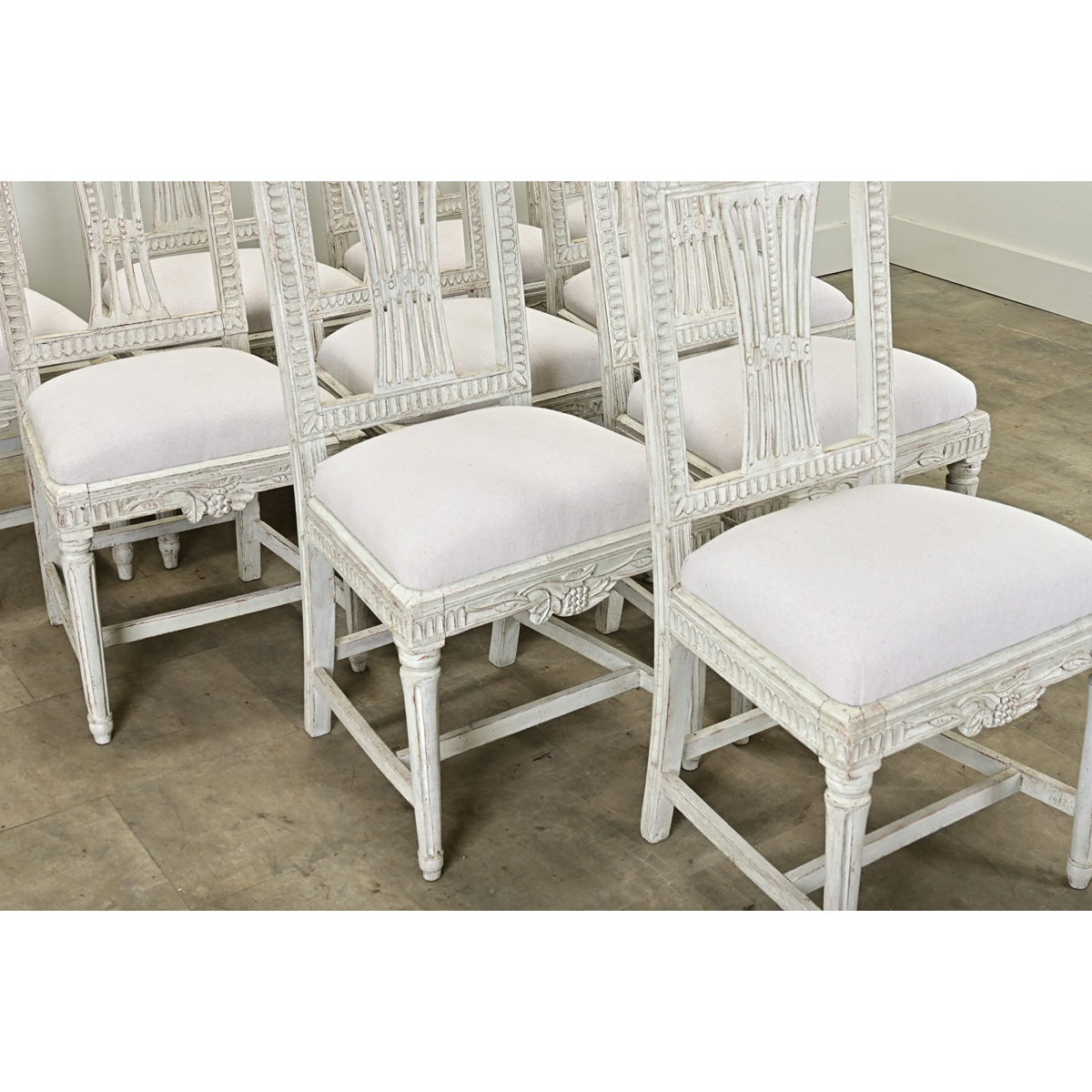 A stately set of ten Swedish Gustavian upholstered dining chairs from the Louis XVI period. These sturdy and comfortable painted chairs are all hand carved with a floral and hop design at the top of the chair back and leaf motifs on the other three sides. There is a similar design on the chair bases, all raised on a pair of turned and fluted front legs. The seat is removable and recently upholstered. Cleaned and tightened these dining chairs are ready for your immediate use, be sure to view the detailed images to see the current condition. Seat height: 18”