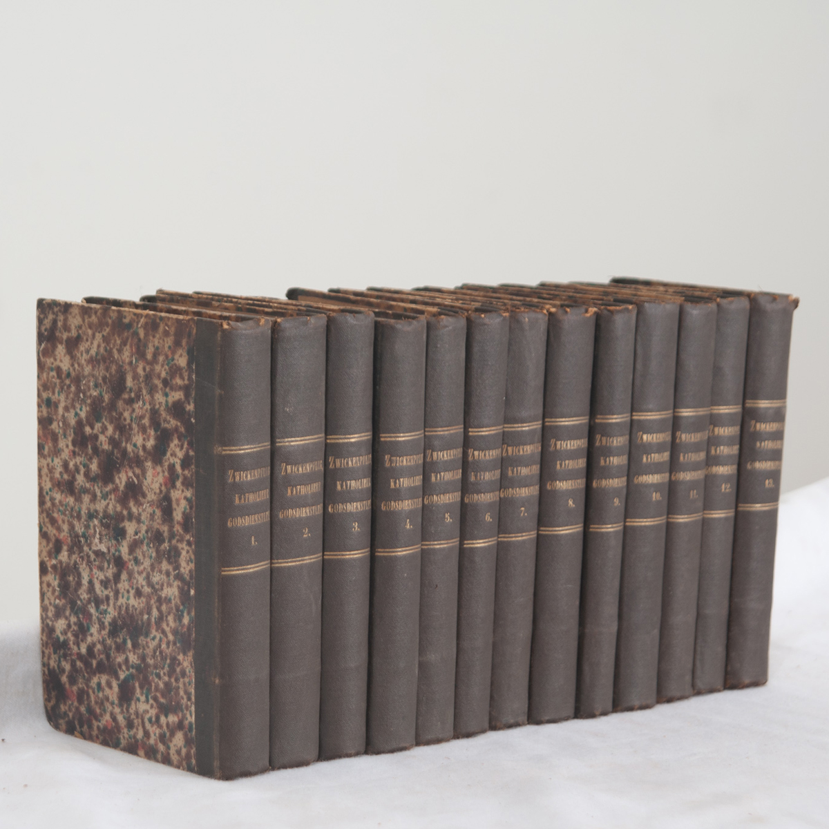A collection of thirteen volumes on theology by K. Zwickenpflug. This set of books are paper bound with the Dutch title, Katholieke Godsdienstleer, author, and respective volume number stamped in gold lettering. The pages have signs of discoloration, make sure to view the detailed images for a closer look at the current condition of this set.