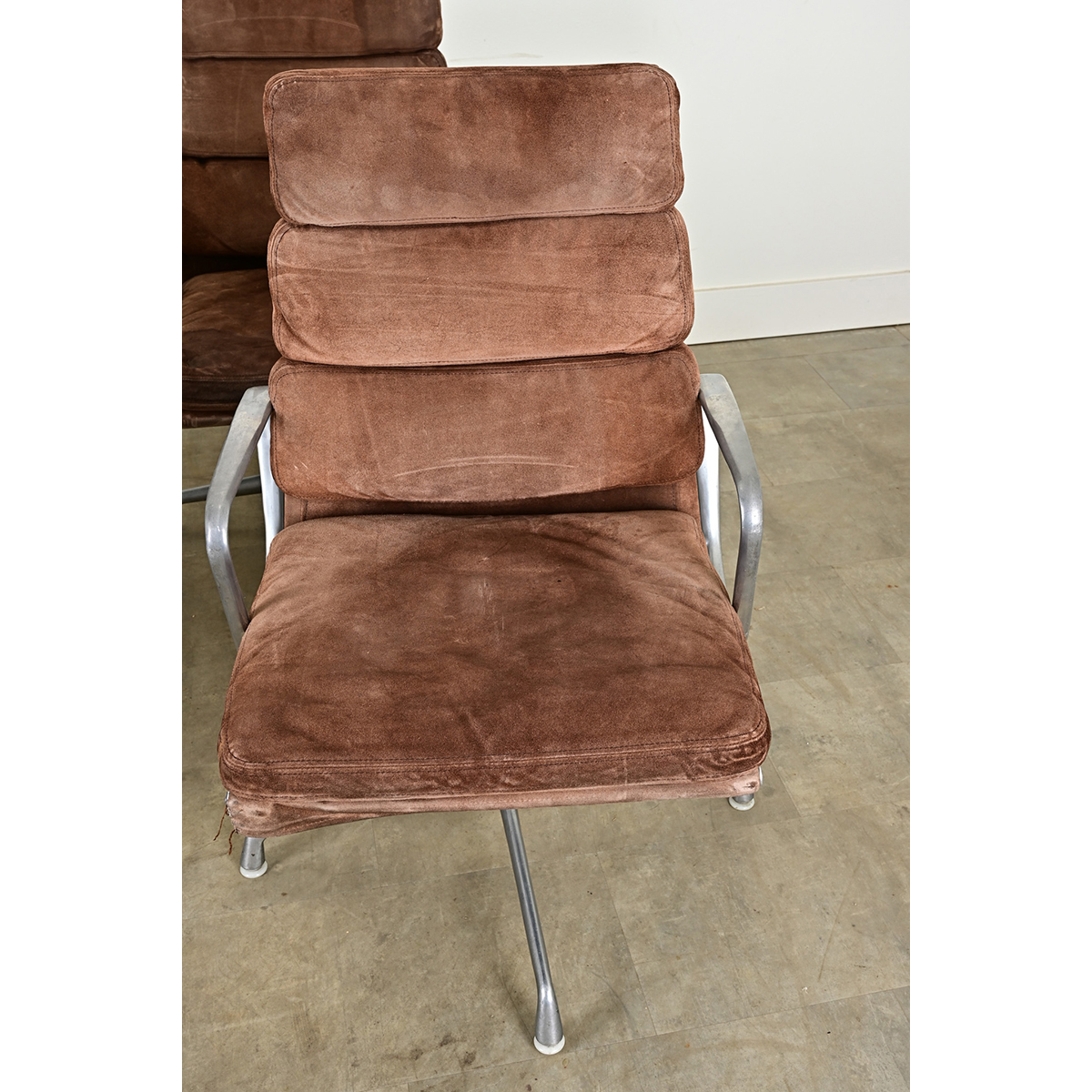 In 1958 the Eames Aluminum Group seating family revolutionized interior design in the domestic and professional spheres with comfortable furniture that spans both. This set of four Soft Pad Executive armchairs by Charles & Ray Eames for Herman Miller are upholstered in original, but worn, chocolate brown suede with tweed fabric outside backs. The aluminum frames are patinated with the expected dents and dings consistent with age and use. Embossed Herman Miller stamp of authenticity on each chair base. View all the detailed images.
