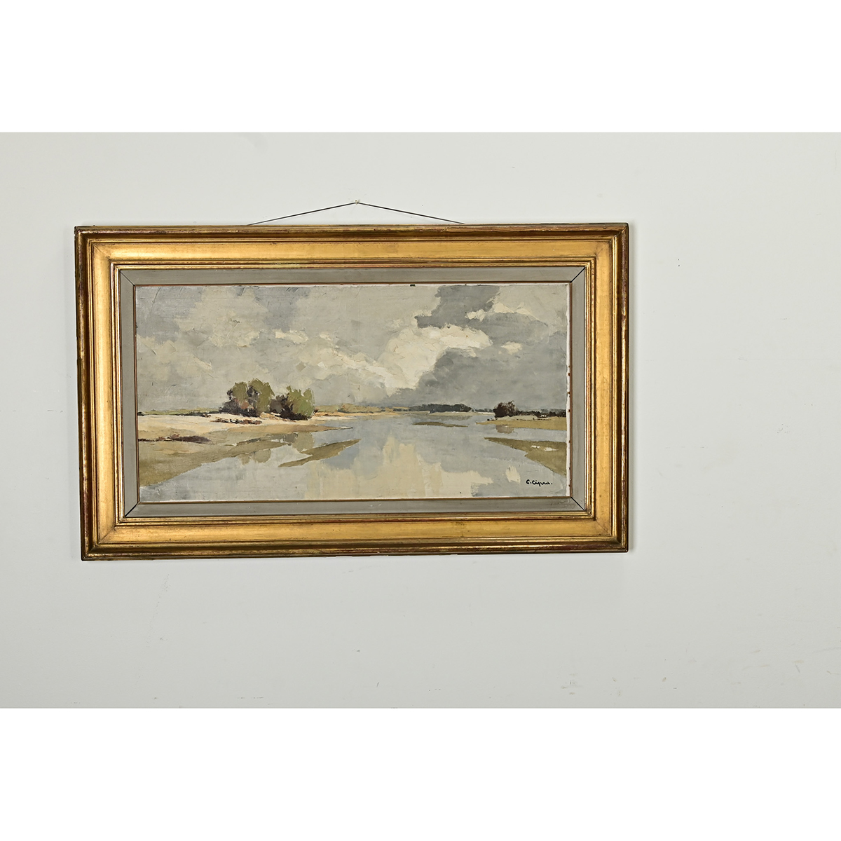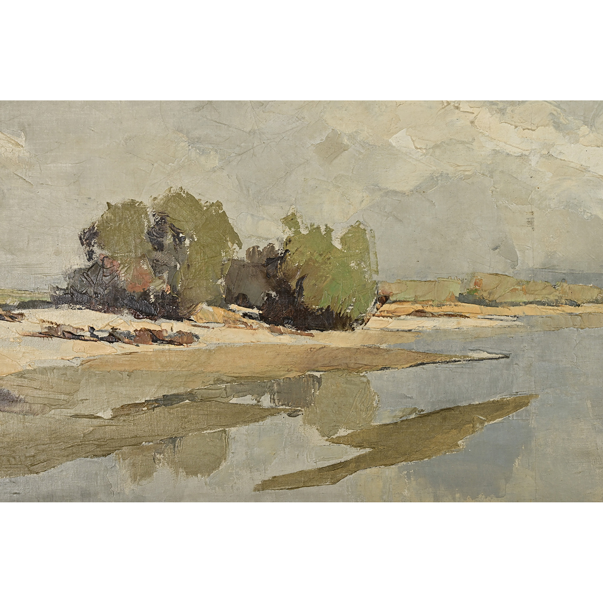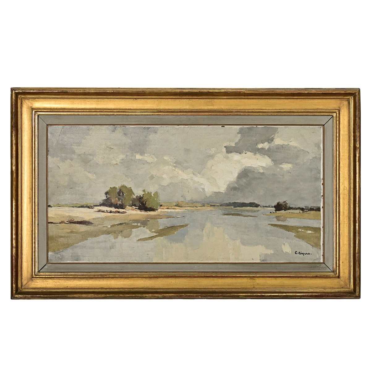 A breathtaking vintage mid-20th century seaside landscape oil painting, from Brazil by way of France, signed by the artist. The abstracted scene blurs the shore between land and sea by mirroring dense cloud cover in the reflection on the water. Rendered in a mostly blue and gray palette, apart from the green vegetation and distant treeline, the artist has captured the dynamic forces of coastal life. Double framed in a painted gray wood and gold gilt molding to complement the expansive quality of the landscape. Strung with picture wire, the piece is ready to hang and enjoy. Some light craquelure texture in the pigment, please view the detailed images to see the current condition.