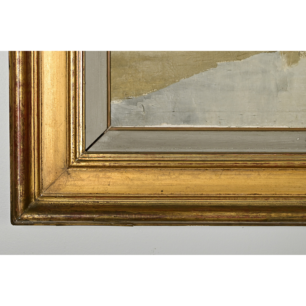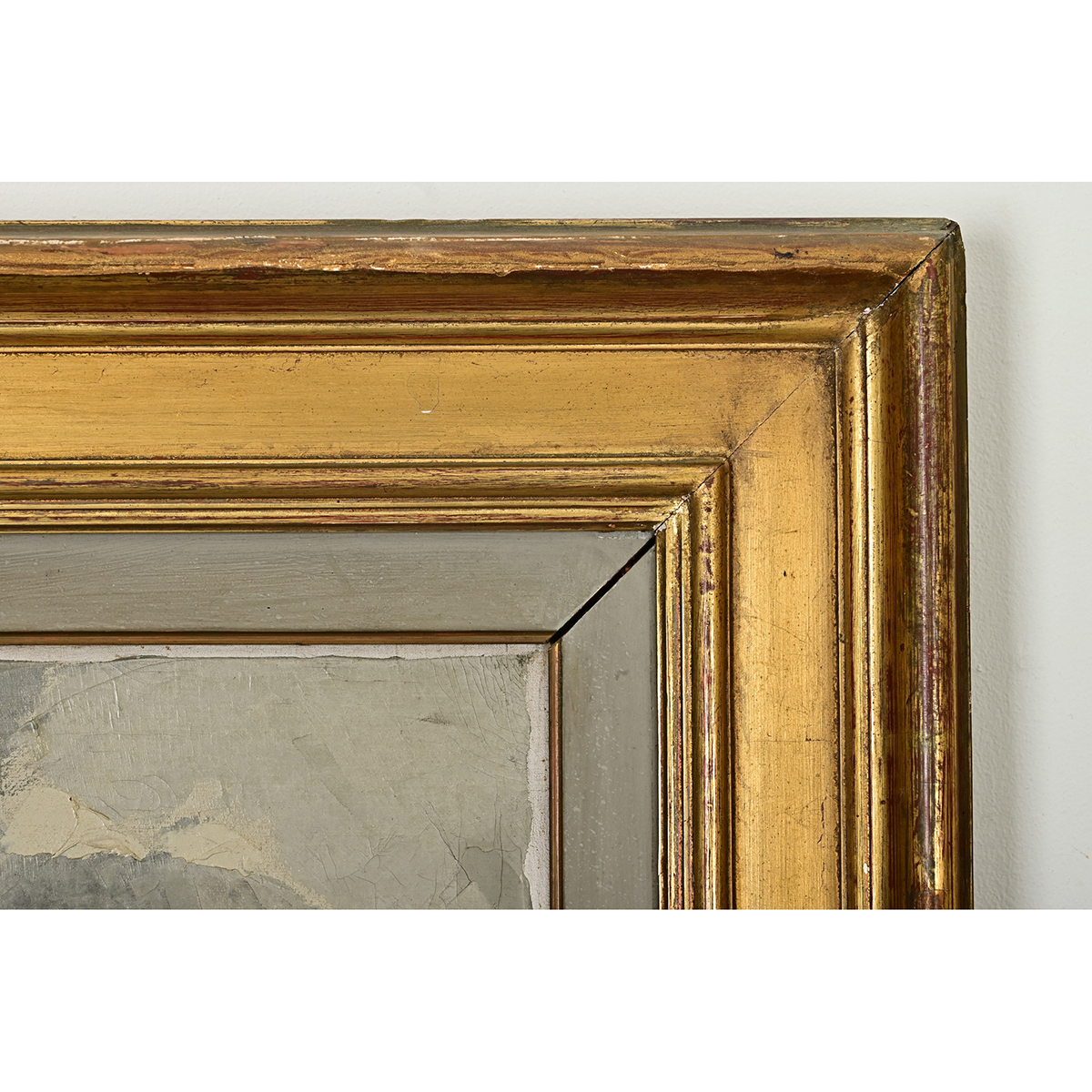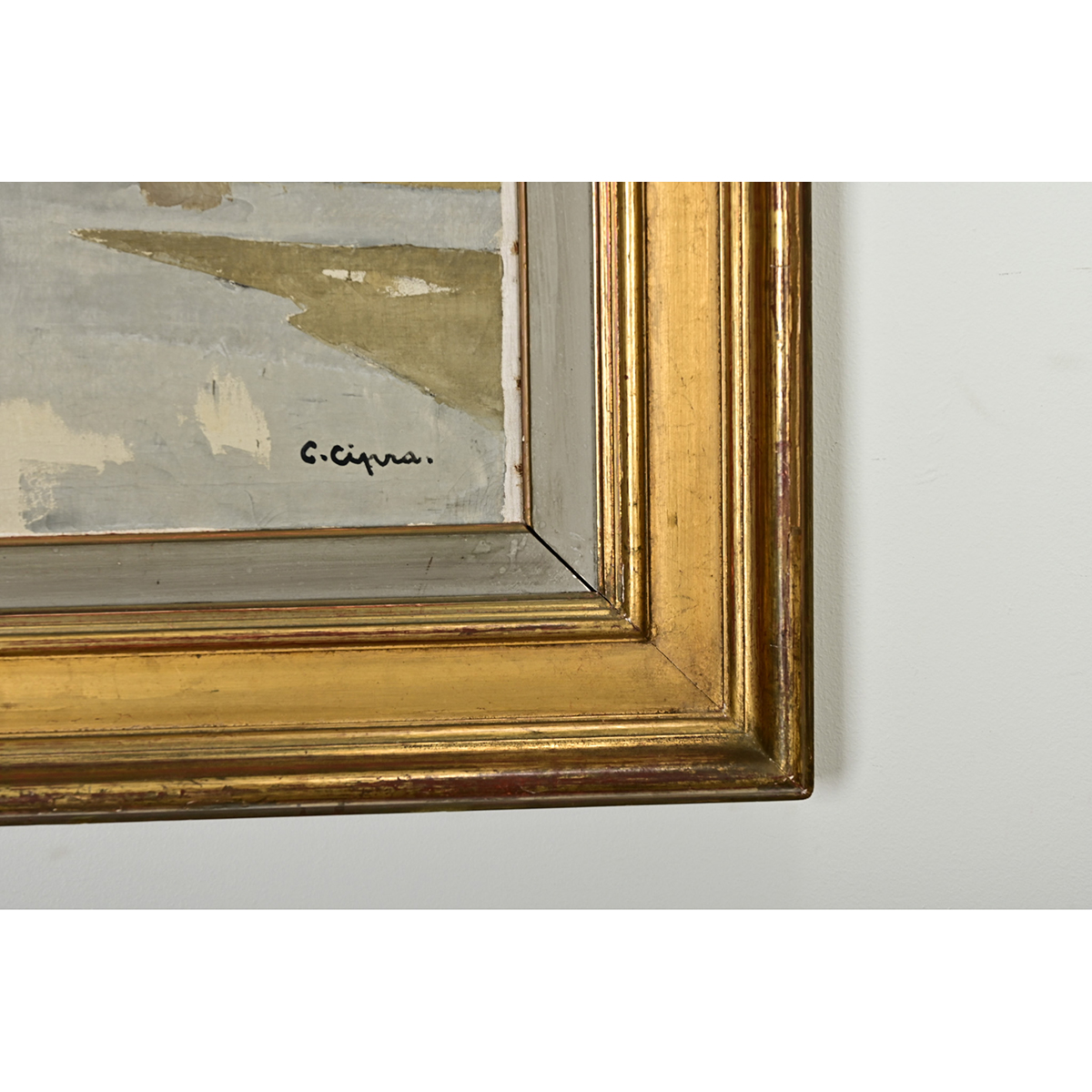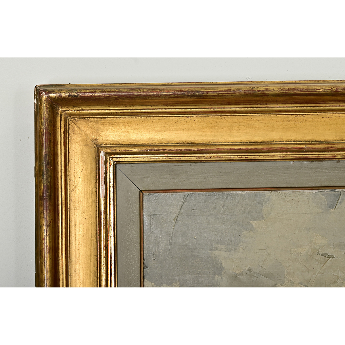 A breathtaking vintage mid-20th century seaside landscape oil painting, from Brazil by way of France, signed by the artist. The abstracted scene blurs the shore between land and sea by mirroring dense cloud cover in the reflection on the water. Rendered in a mostly blue and gray palette, apart from the green vegetation and distant treeline, the artist has captured the dynamic forces of coastal life. Double framed in a painted gray wood and gold gilt molding to complement the expansive quality of the landscape. Strung with picture wire, the piece is ready to hang and enjoy. Some light craquelure texture in the pigment, please view the detailed images to see the current condition.