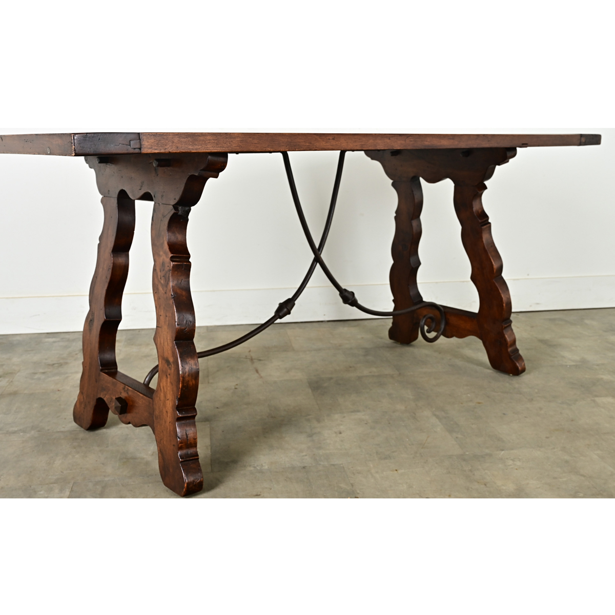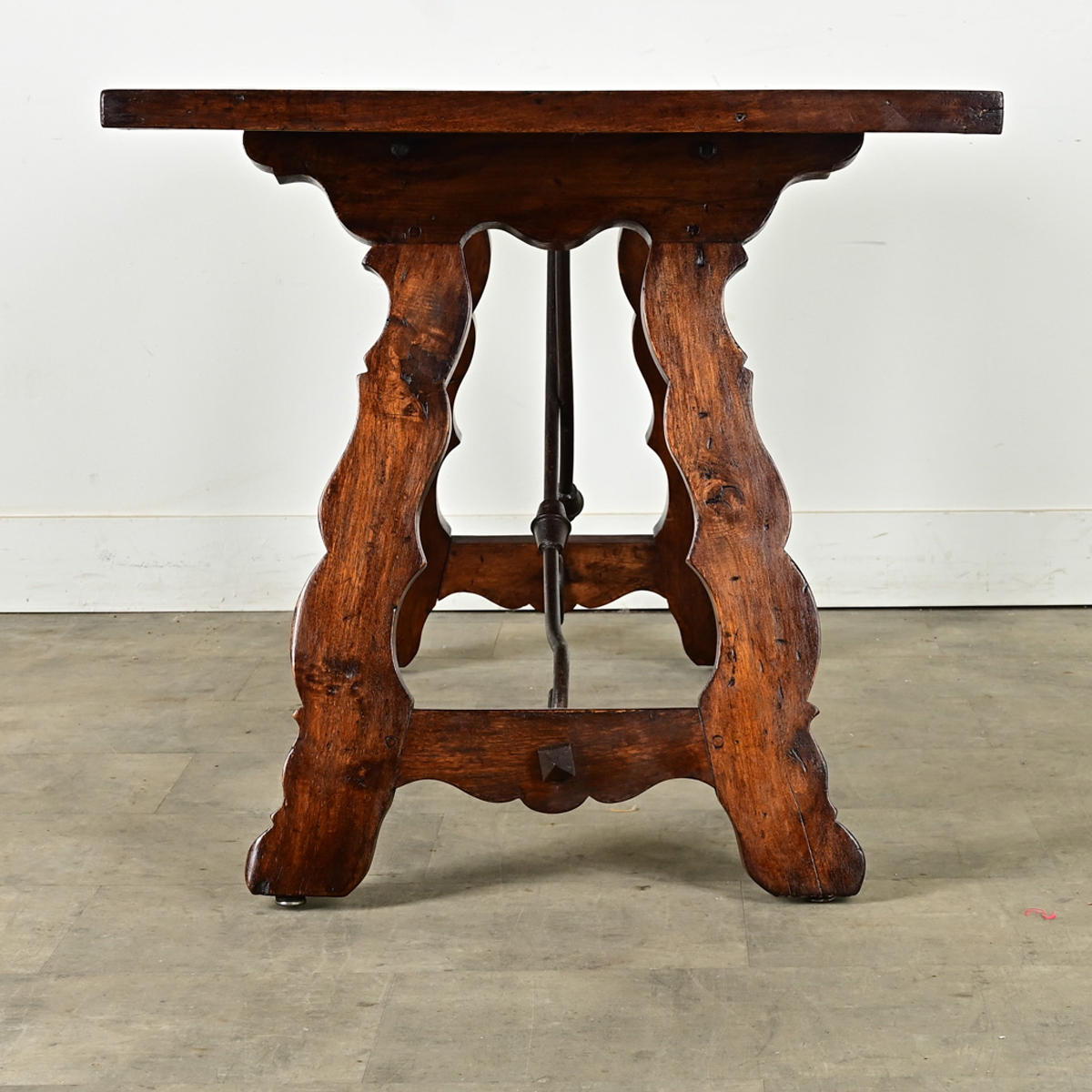 A multipurpose Spanish fratino dining table, console or writing desk from the 19th century in stunning oak and wrought-iron stretchers. Thick top planks in breadboard arrangement are supported by an exquisite base made of splayed, carved lyre legs with an Arabesque profile curved and pointed along the edges. Typical of fratino tables, each sculptural iron bar bypasses the other, swinging from the underside of the top planks to meet the opposite leg ending in a spiral and pinned by a square iron stud on the outside. Whether used as a dining table, work table or console, this Spanish fratino will impart elegance and history to any room. Cleaned and polished with a French paste wax, this antique table is ready to join your interior. Please view the detailed images for the current condition.
