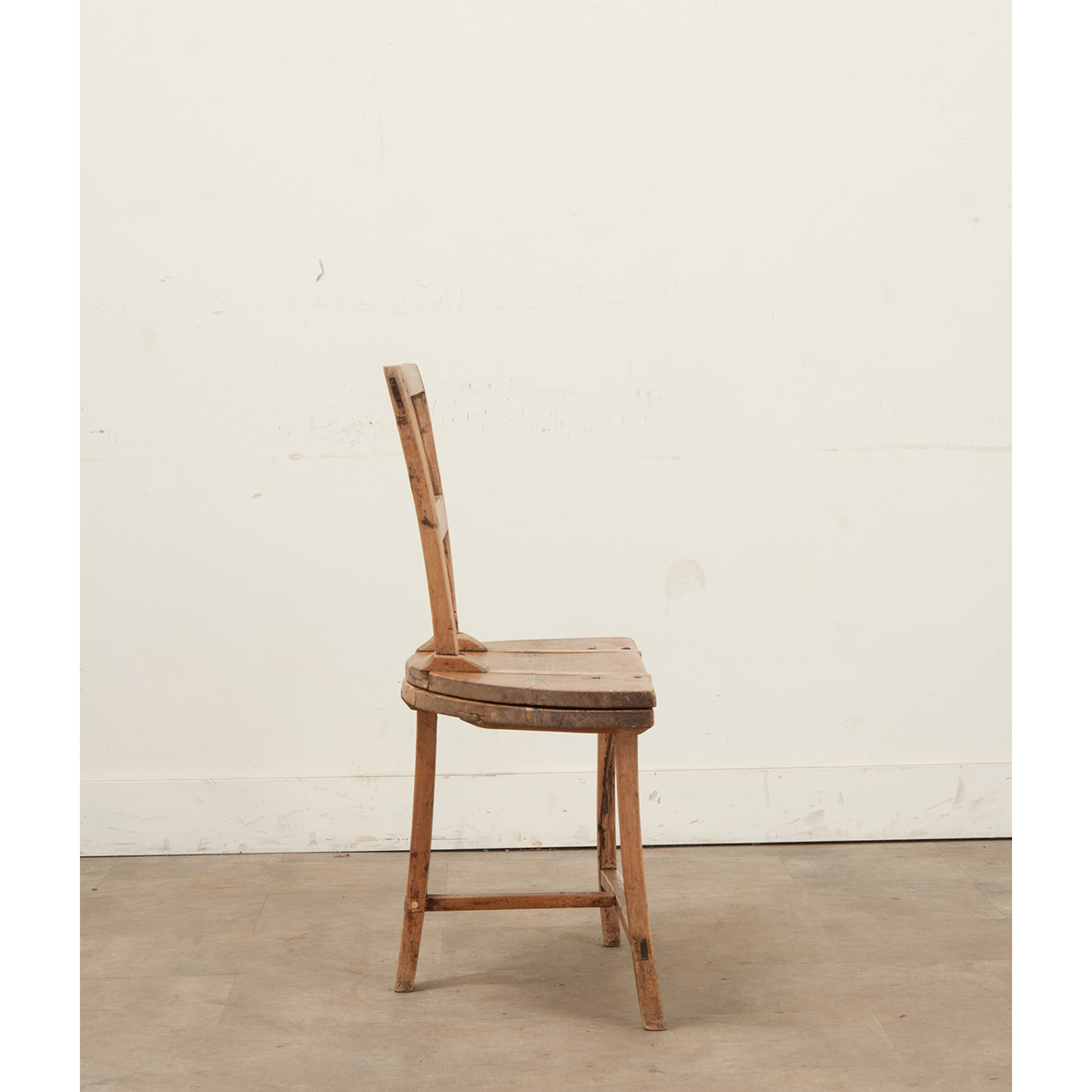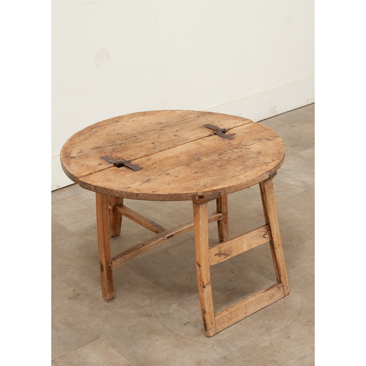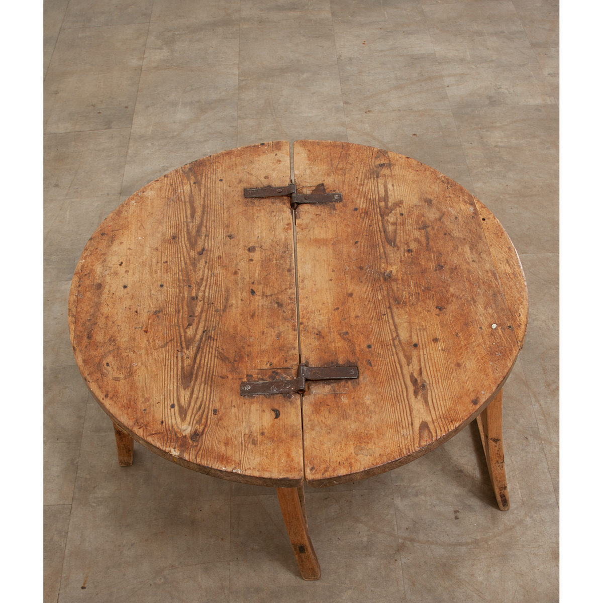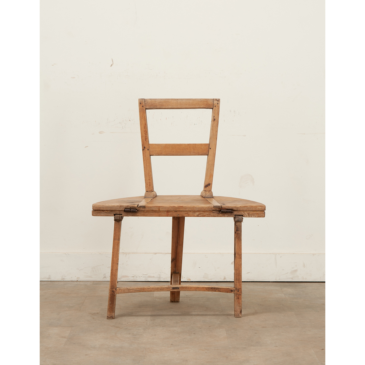 A Swedish pine chair/table from the 1700s, this functional antique is a chair that converts into a coffee table by use of hand-forged iron hinges to pivot the seatback to unfold and become a table leg. The demilune chair seat then doubles in size as the surface of a round coffee/side table. Cleaned and polished with a French paste wax, this metamorphic antique is ready for your immediate use. Be sure to view the detailed images to see the current condition. Chair Dimensions: 36” H x 28” W x 13” D , Seat height: 18”