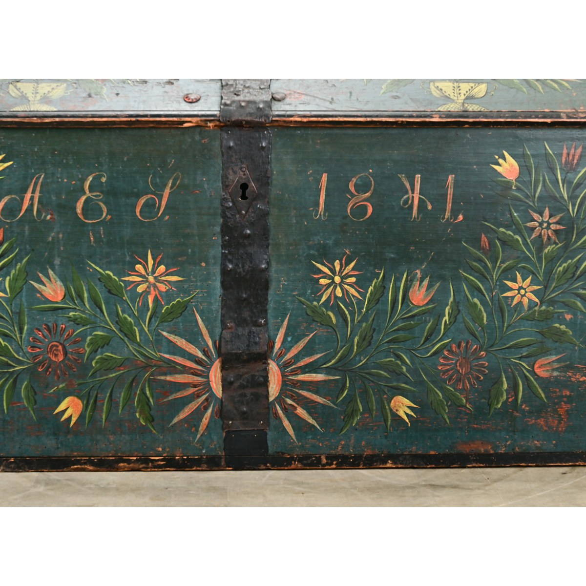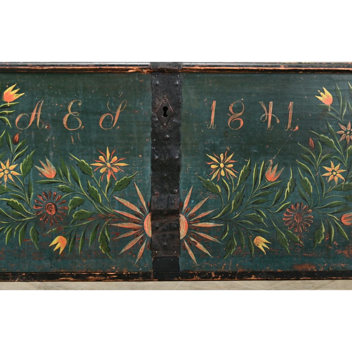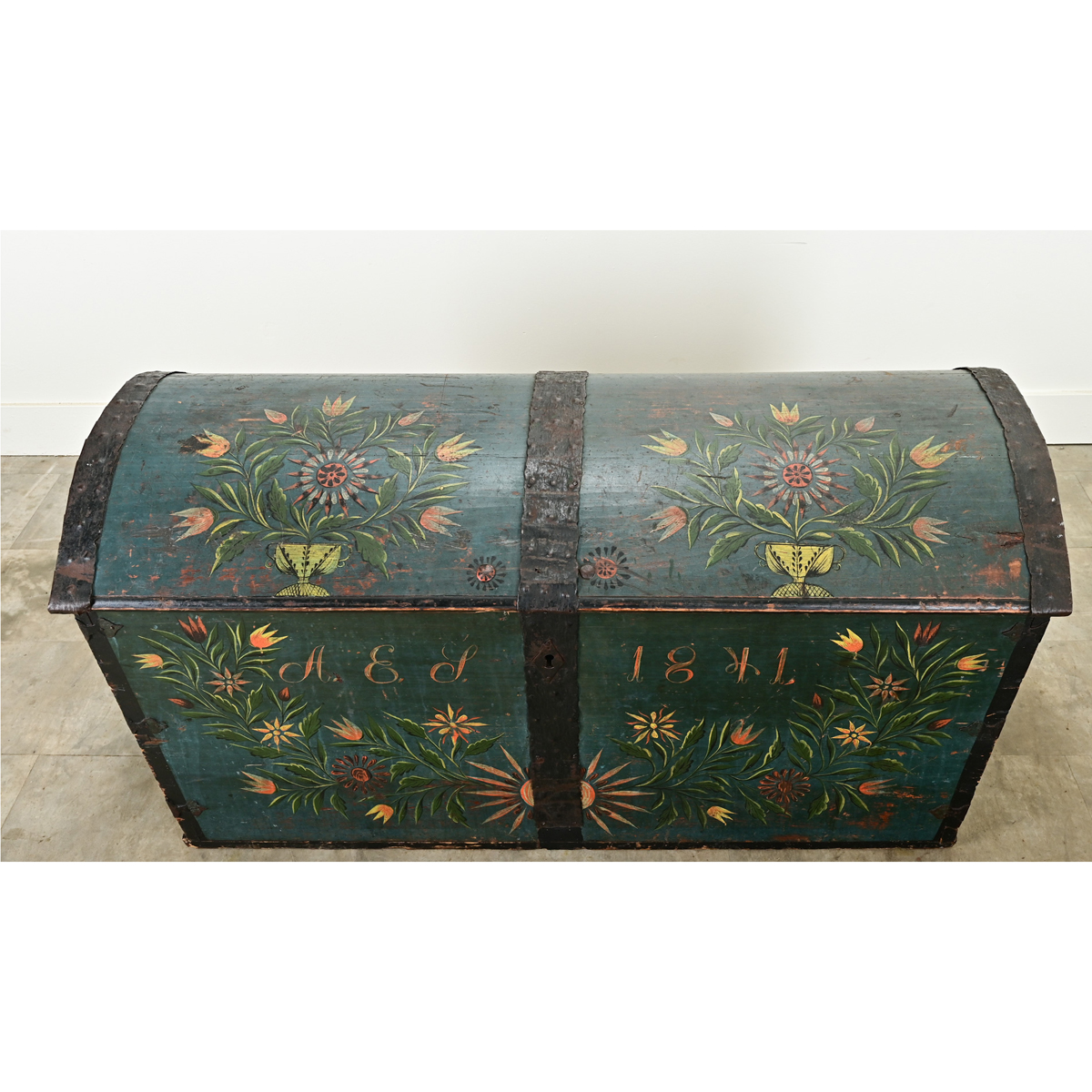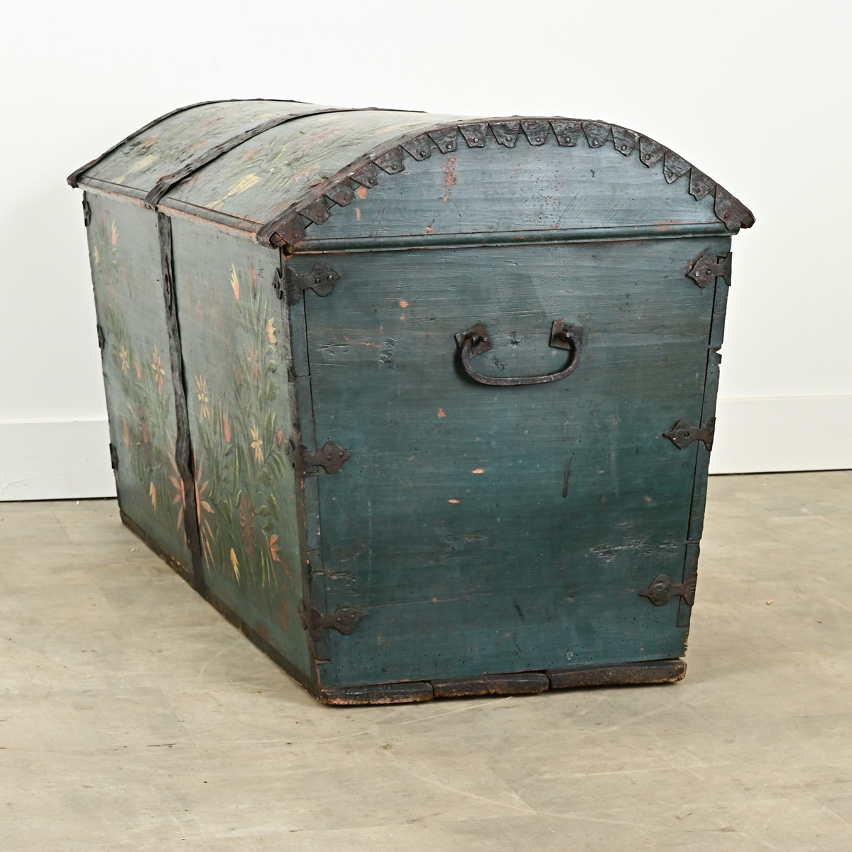 A Swedish 19th century iron bound painted marriage trunk. The exterior of this trunk is painted blue with colorful flower baskets and arrangements on its facade with the monogram, “A E S” and the date, 1841. The domed trunk top is painted with floral patterns and opens on forged iron hinges to a large storage area with a classic candle box in the top right corner. Large forged iron handles are found on each end. Be sure to view the detailed images to see the current condition of this painted trunk.