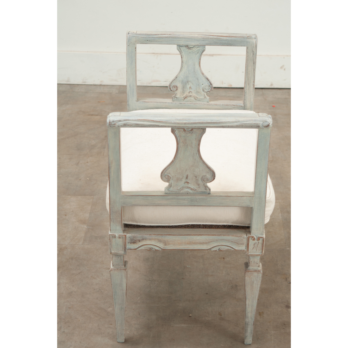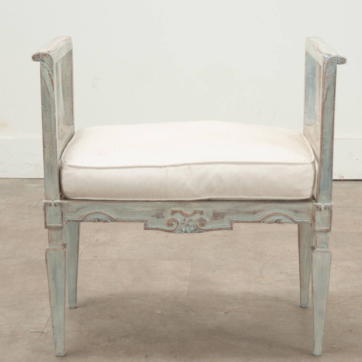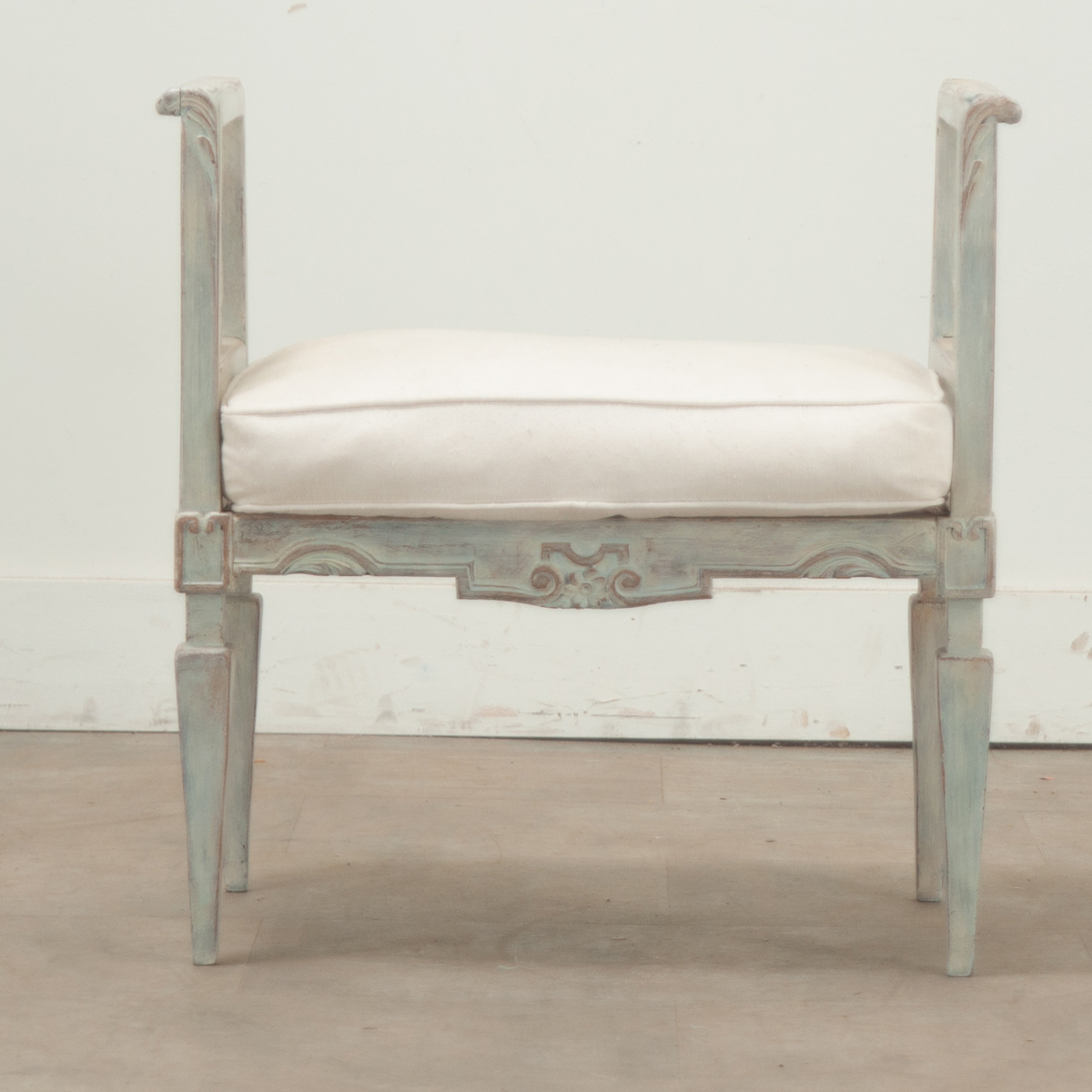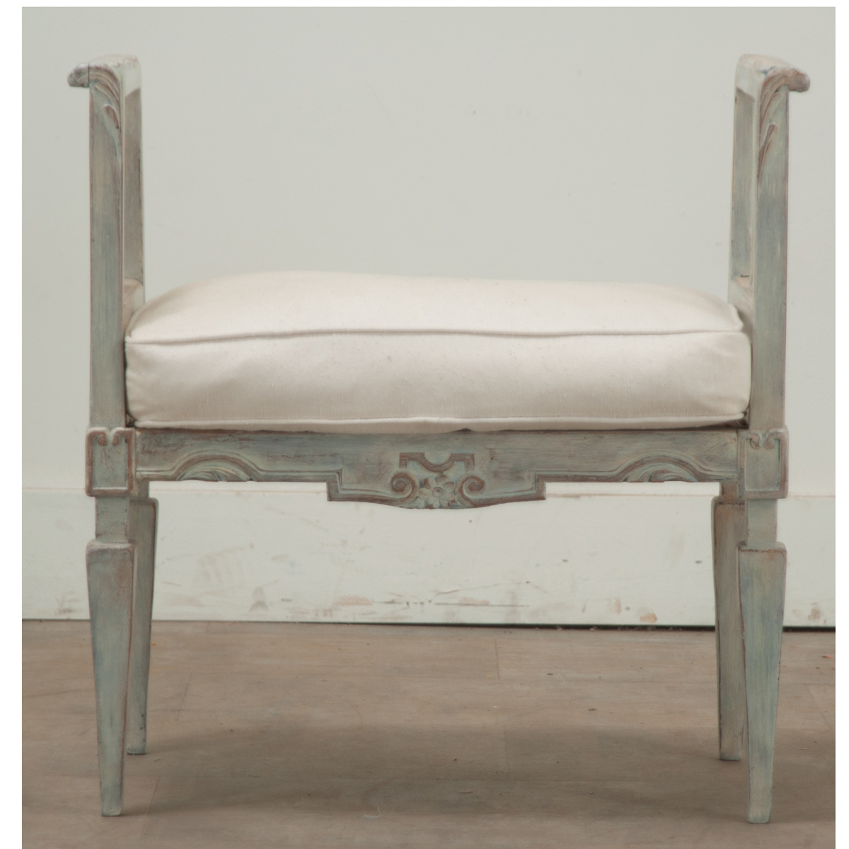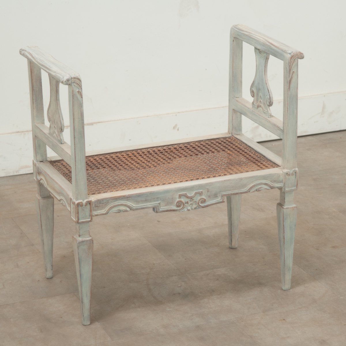 A hand carved hall or window bench made in Sweden. This sturdy window seat is made from hand painted wood and has a cane bottom with a removable custom cushion (the cushion has been used). The bench has carved arms and the whole is raised on tapered legs. Be sure to view the detailed images to see the current condition of this window seat. Seat height: 16 ¼”