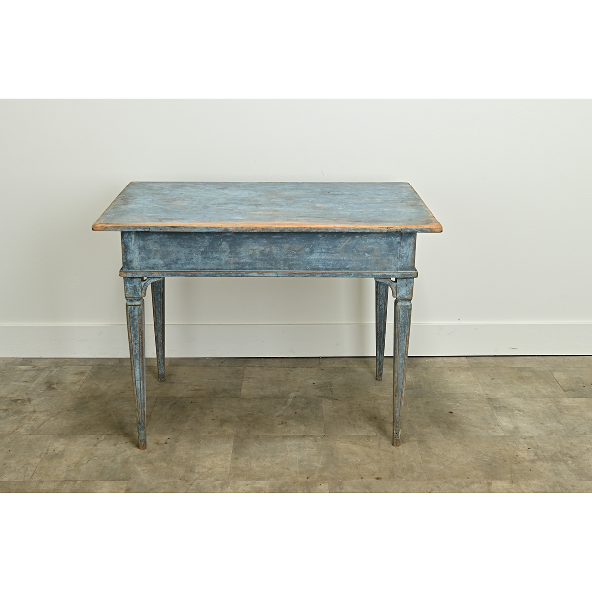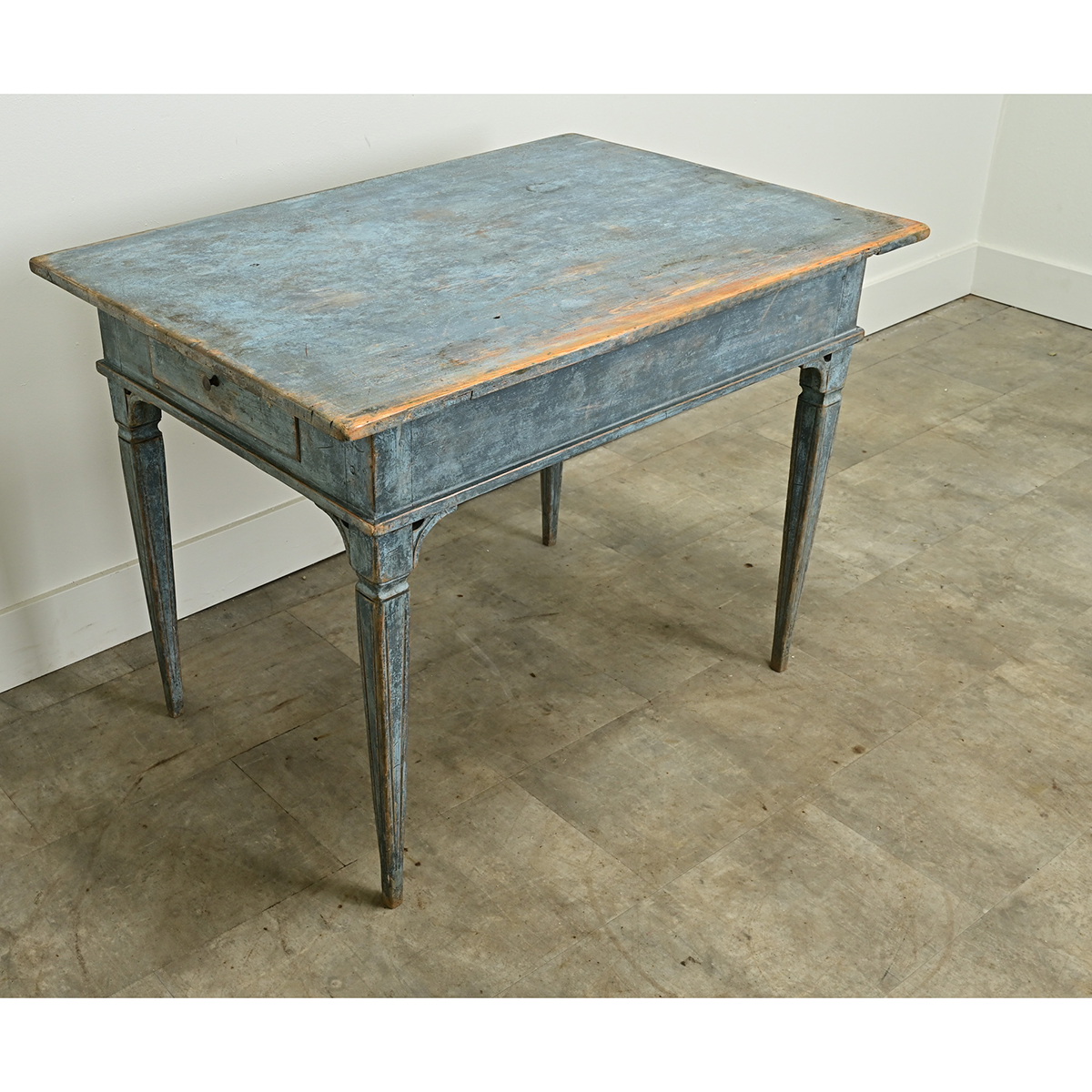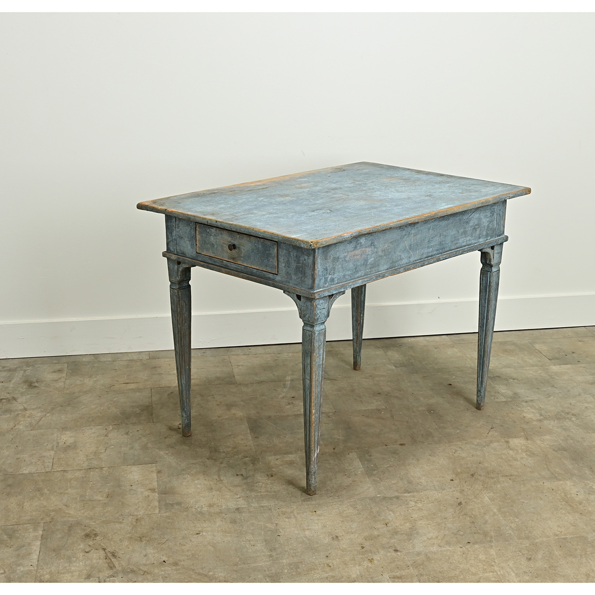 A Swedish Gustavian style center table is sure to make a statement in any interior. This table has its original worn blue painted finish and features a removable top over an apron with two drawers, each with a turned knob. The whole sits on tapered and fluted legs. Be sure to view the detailed images to see the current condition of this antique center table. Knee Clearance: 23 ½”