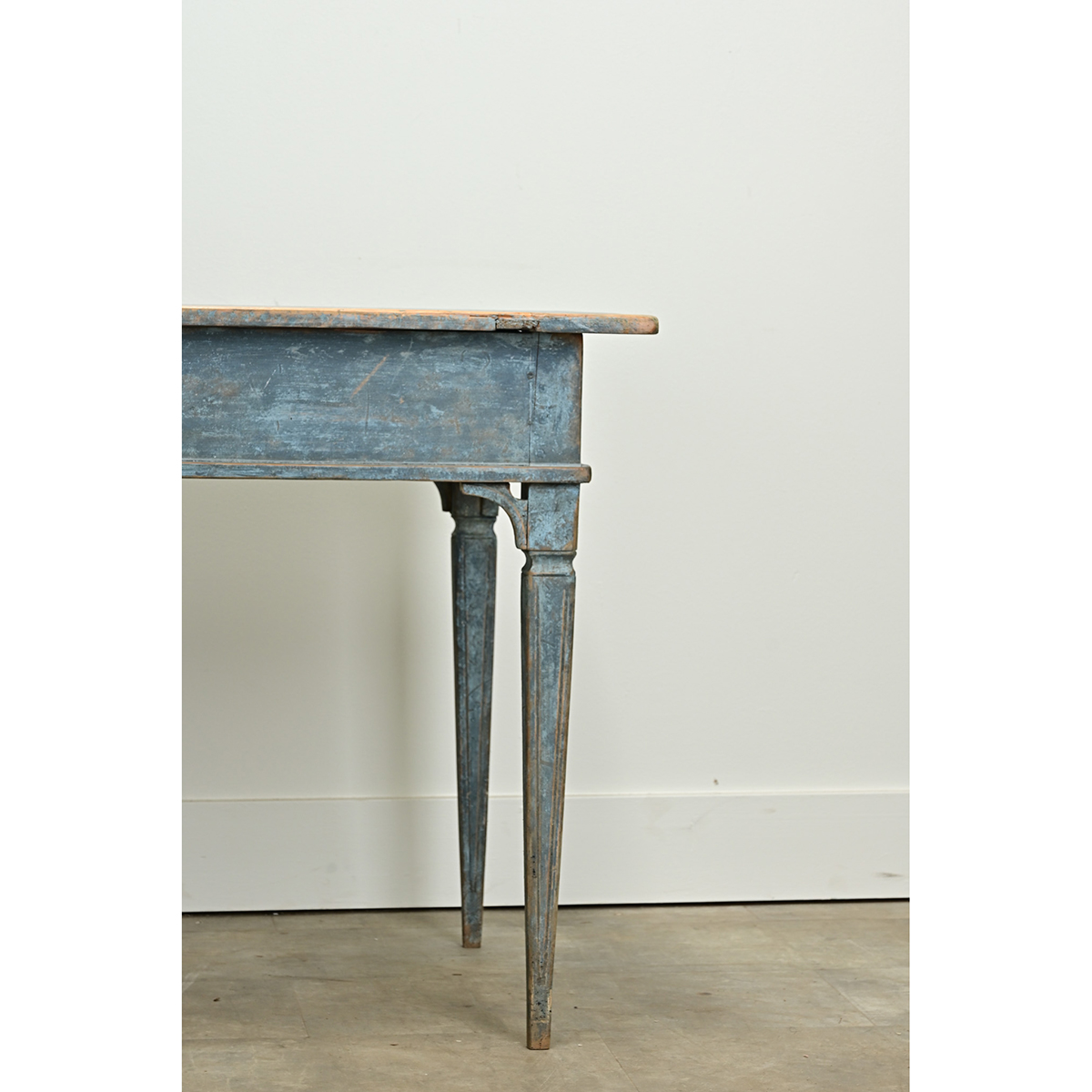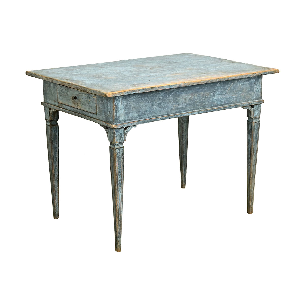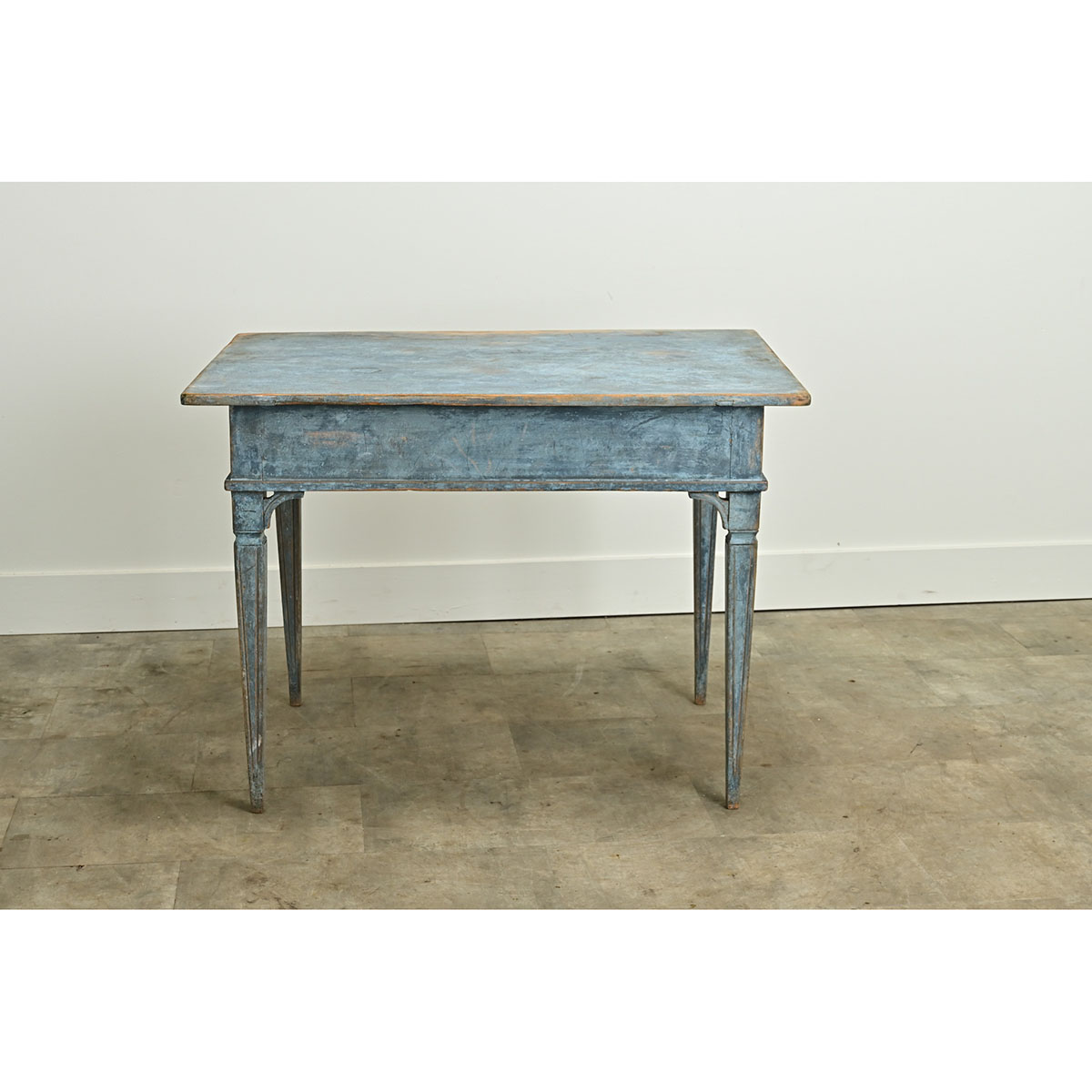 A Swedish Gustavian style center table is sure to make a statement in any interior. This table has its original worn blue painted finish and features a removable top over an apron with two drawers, each with a turned knob. The whole sits on tapered and fluted legs. Be sure to view the detailed images to see the current condition of this antique center table. Knee Clearance: 23 ½”
