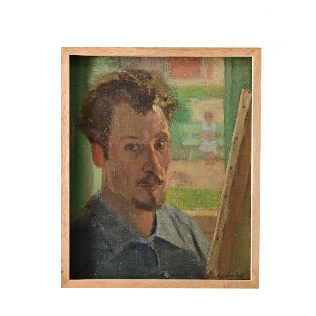 An alluring vintage painting on canvas by Belgian artist Antoon Luyckx (1922-2017), it appears to be a self-portrait of him in front of a canvas (work-in-progress) staring back at the viewer. Behind him in the background, through the window, is a solitary figure waiting on a bench, however the artist has chosen to use a “soft focus” effect to obscure the view. Recently reframed in simple yet complementary oak molding. Please view the detailed images to see more. Signed by the artist to the lower right.