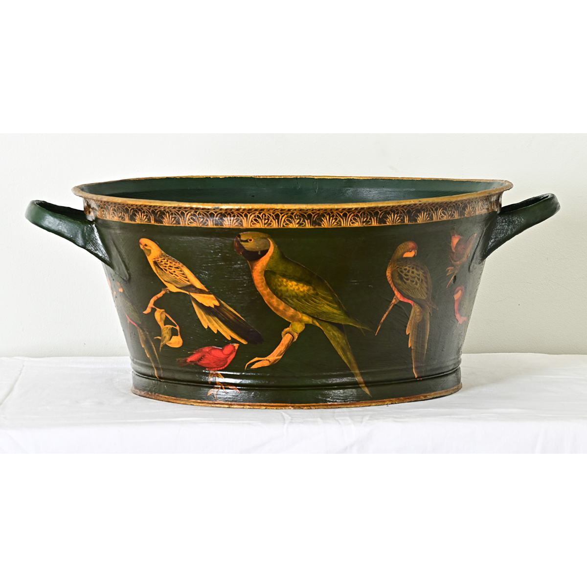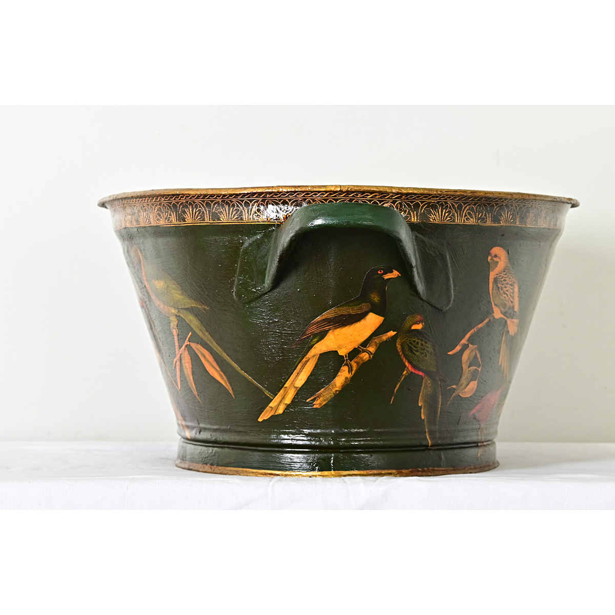 This antique English tole bucket has been recently updated with new paint and decoupage of parakeets and other avian friends. The substantial size of the bin provides a wonderful canvas for the hunter green paint to contrast the vibrant birds and seemingly gilded decoupage border at the rim. Sturdy handles and undecorated interior encourage use of this fun receptacle for storage anywhere around the home. Please view the detailed images.