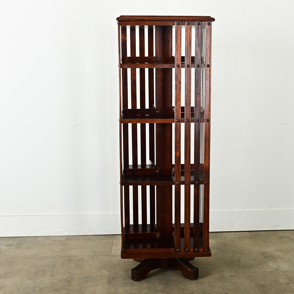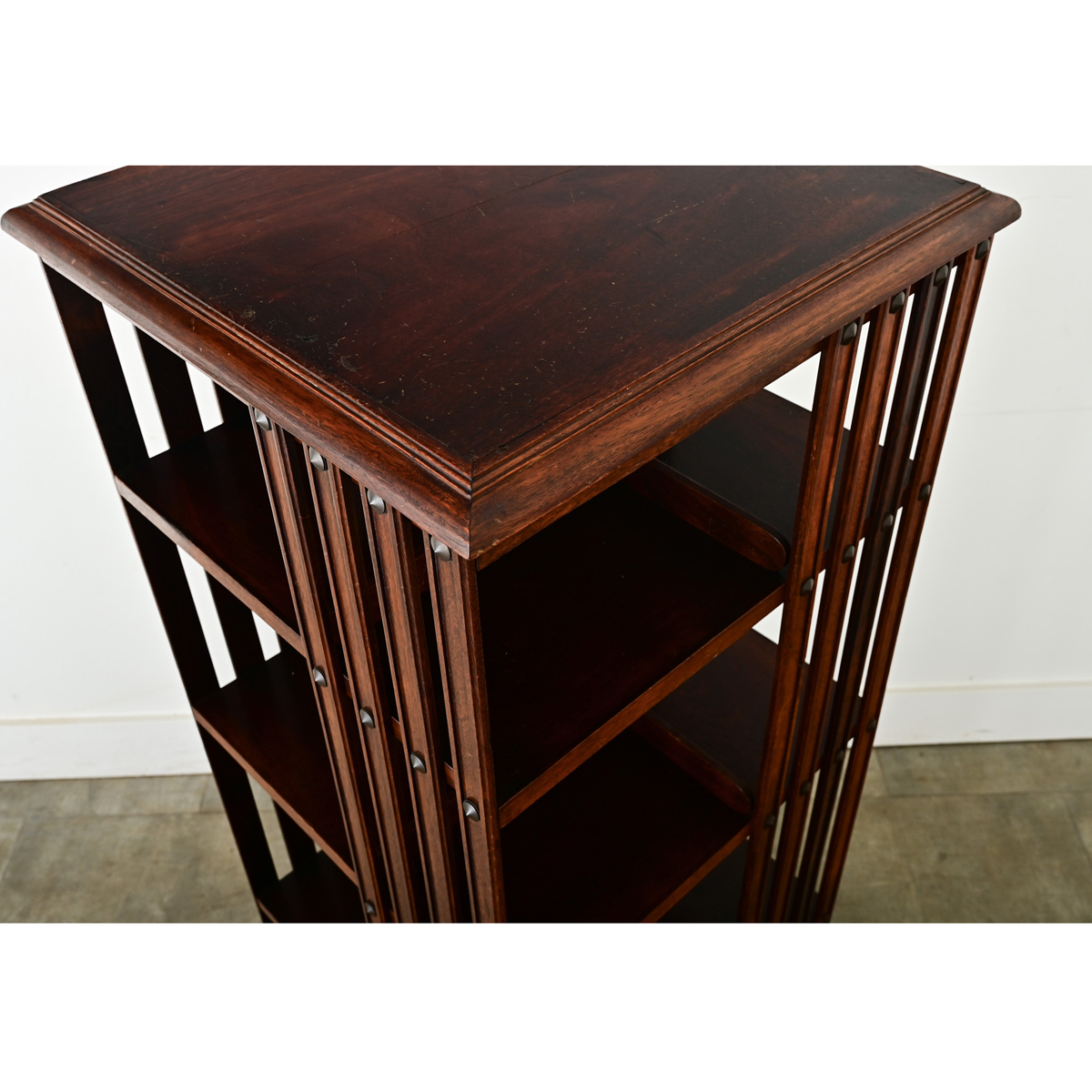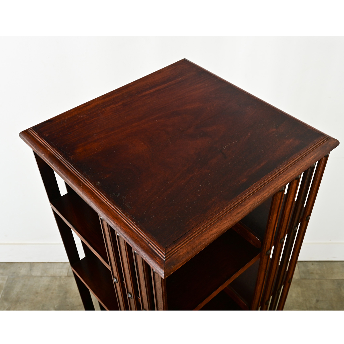 A very practical design, this French mahogany revolving bookcase takes up very little room on the floor yet offers plenty of shelf space. The clean lines would work well in nearly any interior decoration style. Four different shelf heights to accommodate a variety of collections. View the detailed images.
