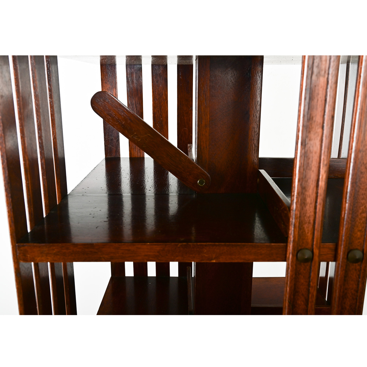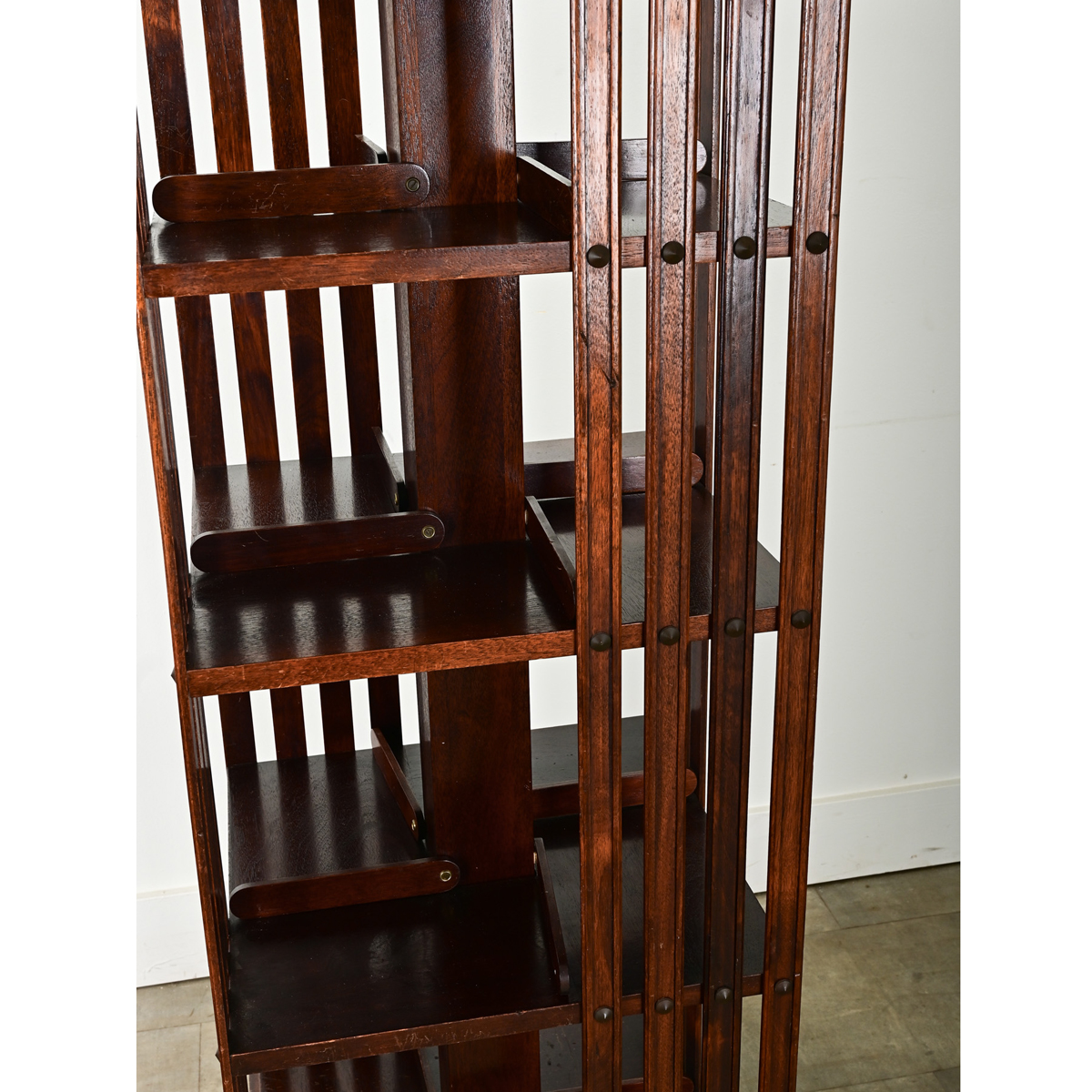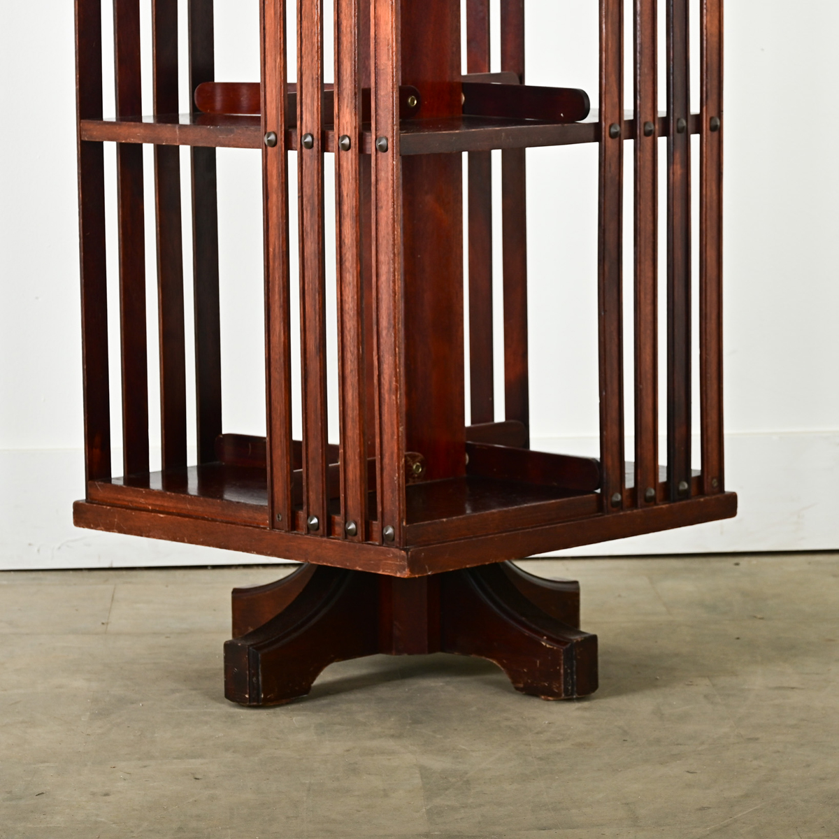 A very practical design, this French mahogany revolving bookcase takes up very little room on the floor yet offers plenty of shelf space. The clean lines would work well in nearly any interior decoration style. Four different shelf heights to accommodate a variety of collections. View the detailed images.