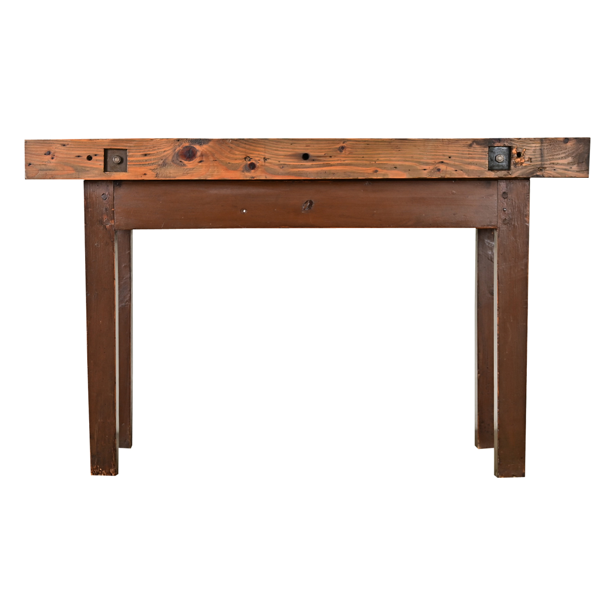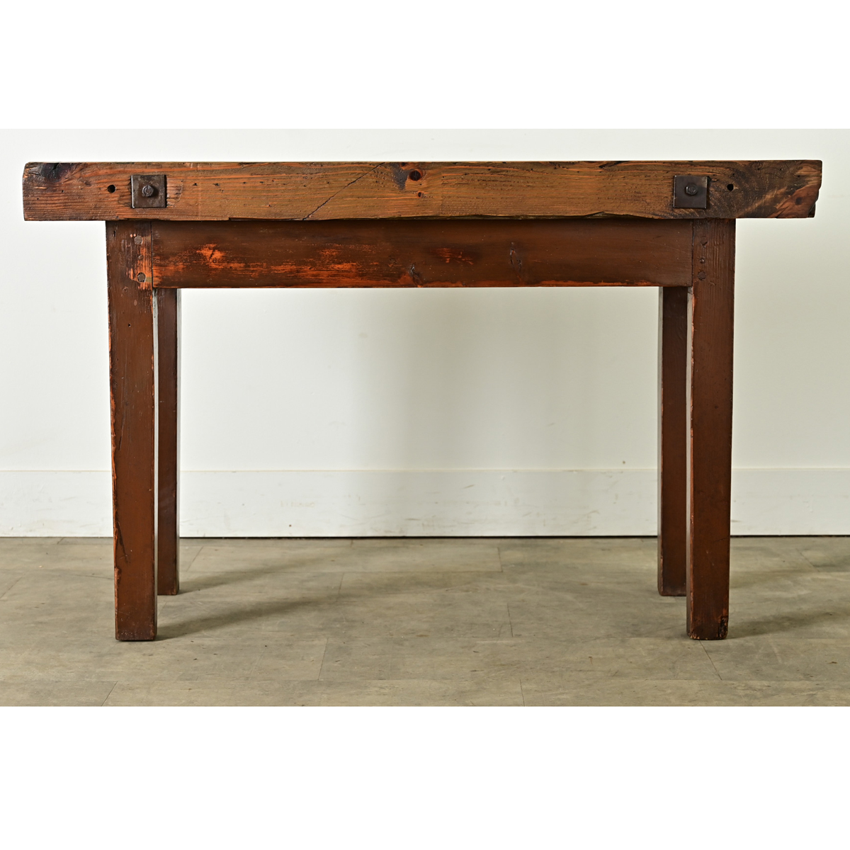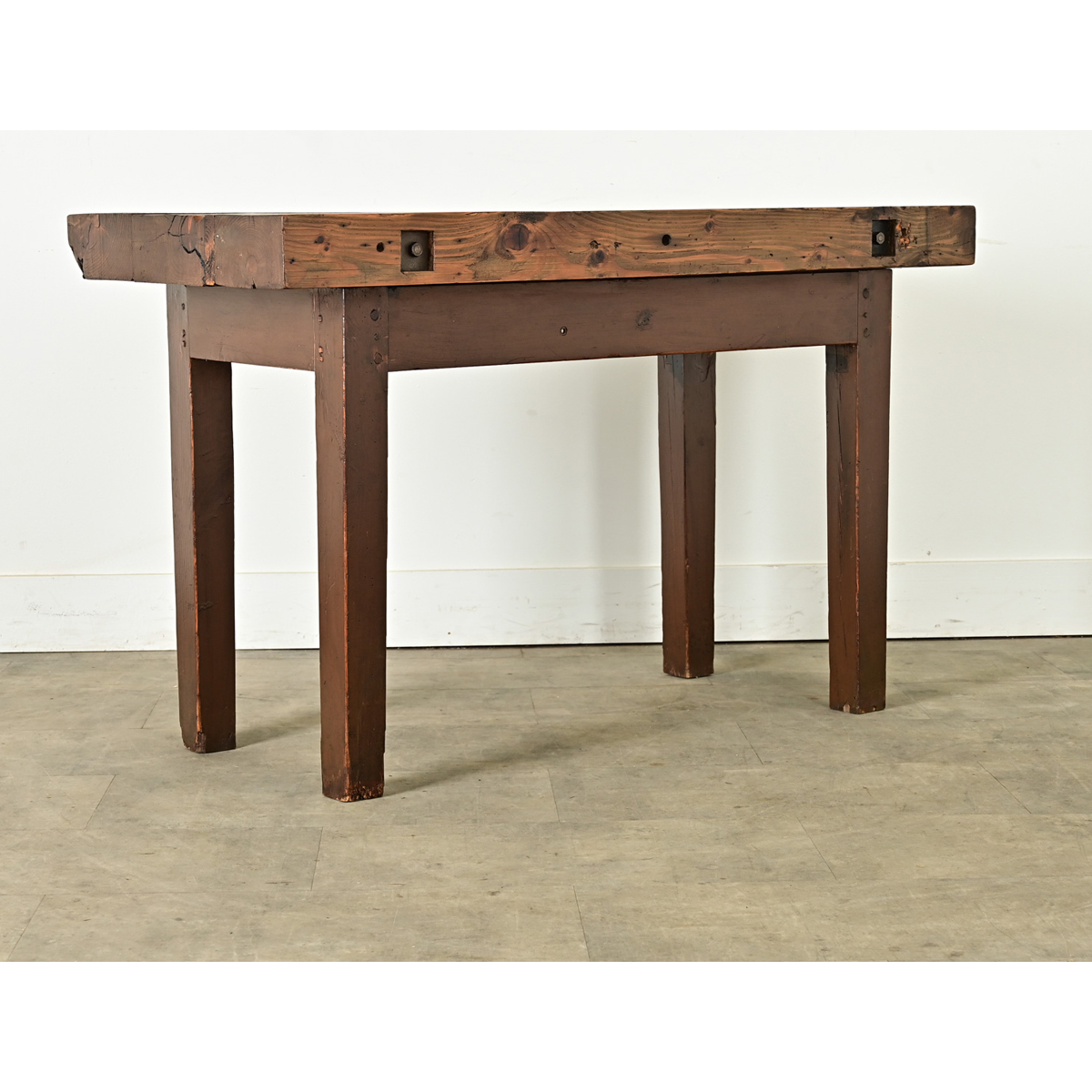 This French 19th century workbench is a fascinating relic of technology from before the assembly line, a hybrid of artisanal rusticity and industrial innovations. The top planks are impossibly thick, patinated by saws and hand tools necessary to the carpenter’s craft, punctured with five holes to adjust a “holdfast” iron rod for securing a project to the table. Four variably sized and roughly hewn legs support the top and a trough-like lower shelf. A large vise grip projects from the left leg, opening by a wood-handled crank to unscrew the bolt–a potentially useful feature should one want to repurpose this piece as a console table for an entryway. The awe-inspiring workbench appeals to multiple design tastes, from brutalism to industrial to primitive for its charming imperfections. Cleaned and polished with a French paste wax, ready for your interior. Please view the detailed images.