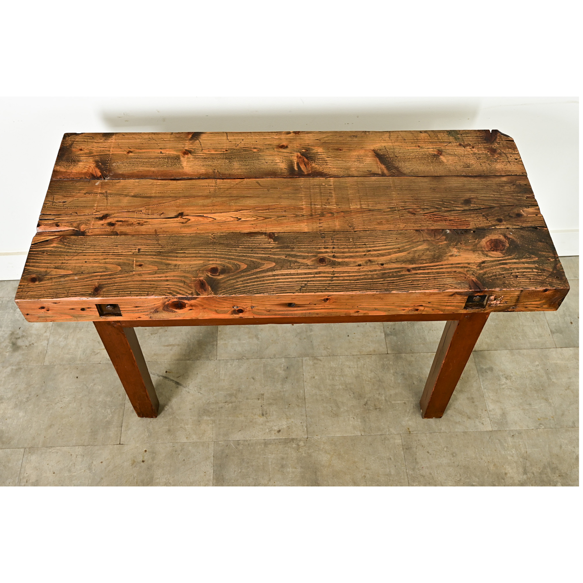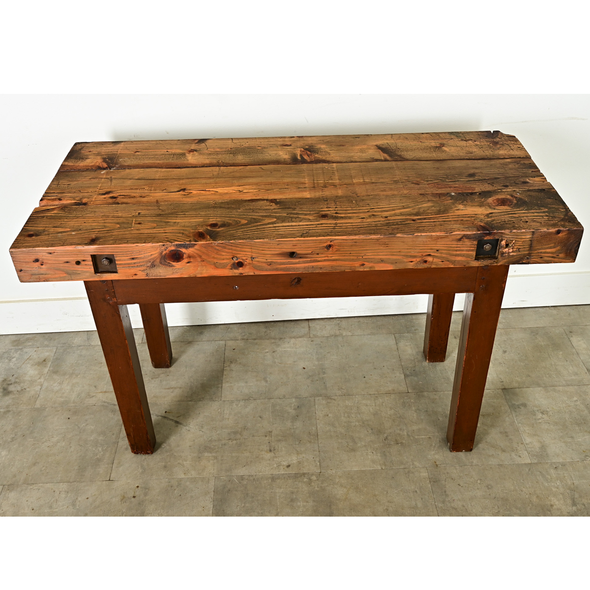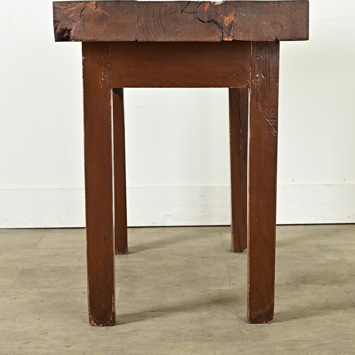 A French artisan’s work table from the 19th century made from oak and pine could easily be used as a small kitchen island or sturdy console. This utilitarian antique has a thick top (3 ½”) assembled from three sections of pine–beautifully patinated–that are held together with steel bindings visible on the long sides. Thick block legs in oak support the whole and are stained an opaque chestnut tone. Cleaned and polished with a French paste wax, this workbench is ready for your interior. Please be sure to look at the detailed images to see the current condition.