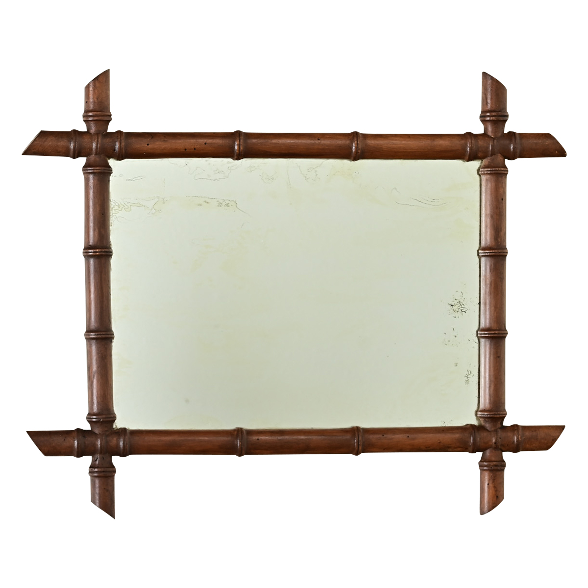 A faux-bamboo mirror from France, turn of the century circa 1890, with a lovely amber-brown patina in the frame. Currently strung to mount in an east-west direction, this mirror features rectangular proportions and symmetry to hang in either direction, made of carved pine to appear as (faux) bamboo down to the intermittent nodes projecting with slanted corners. The mirror draws us with its exotic appearance and lovely color, making it a great choice to decorate any room and across a multitude of interior design tastes. An original mirror plate shows a concentration of foxing along the bottom edge, adding to the organic qualities of the piece. Make sure to view the detailed images for a closer look.