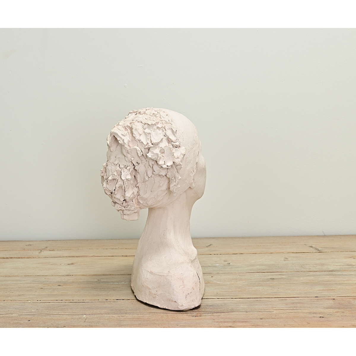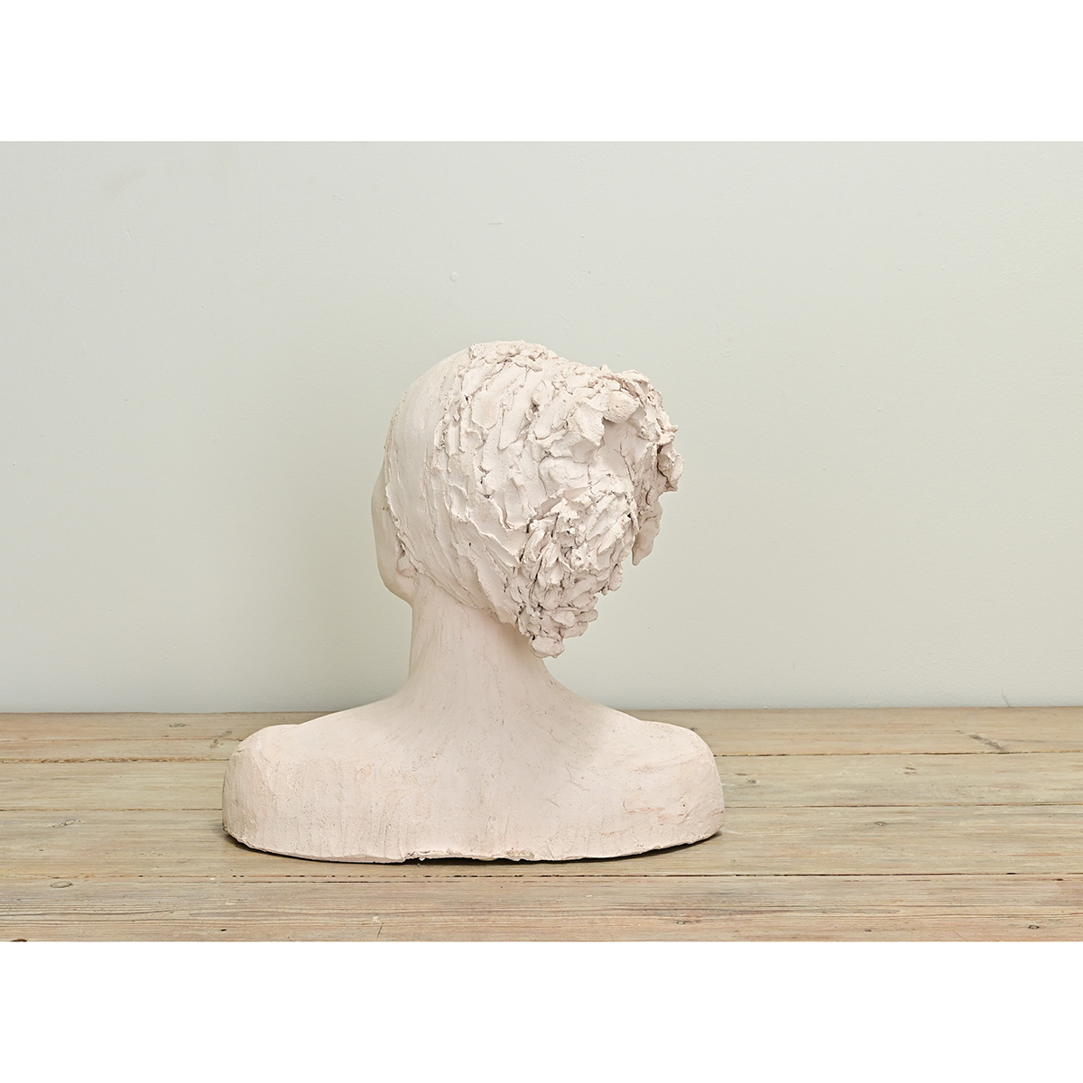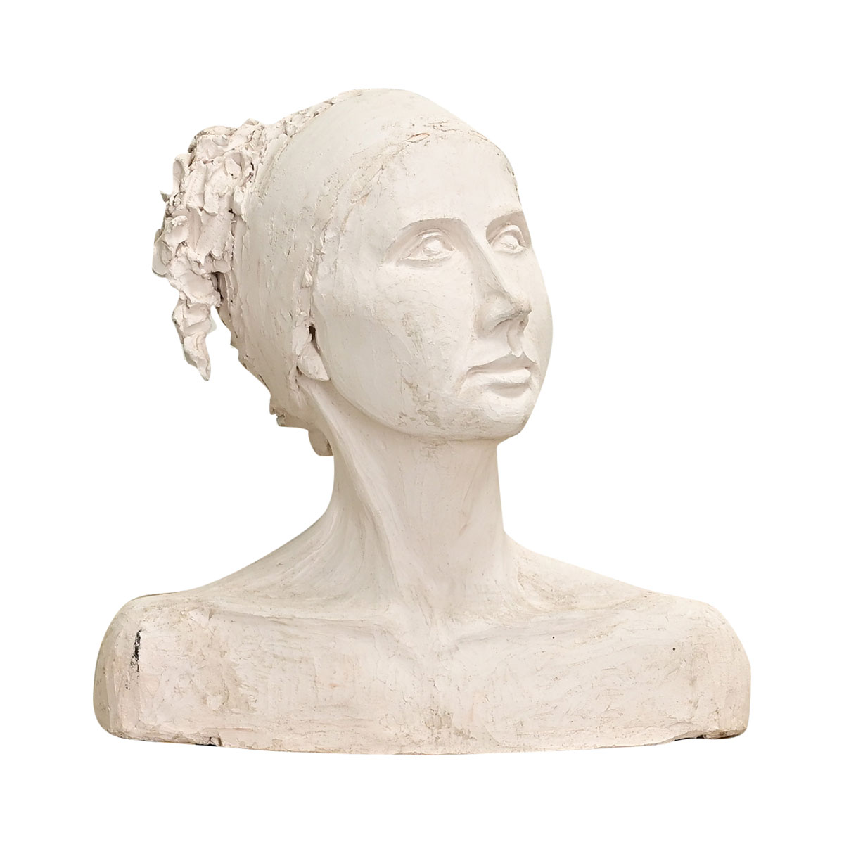 French vintage bust of an anonymous Greco-Roman lady in larger-than-life scale, her noble likeness rendered in chalk-white plaster. Her hair is pulled high on her head, bound by a laurel leaf crown that enhances the slender face and neck which merges with the square pedestal base to display the work on nearly any surface. The artist’s delicate touch with the medium is evident throughout the plaster, left raw and undecorated for the viewer to project their own ideas of who she was and how she may have looked beyond the stoic features captured here. There is one small hole on the back of the scalp; please view the detailed images to see the current condition as they are an essential part of the description.