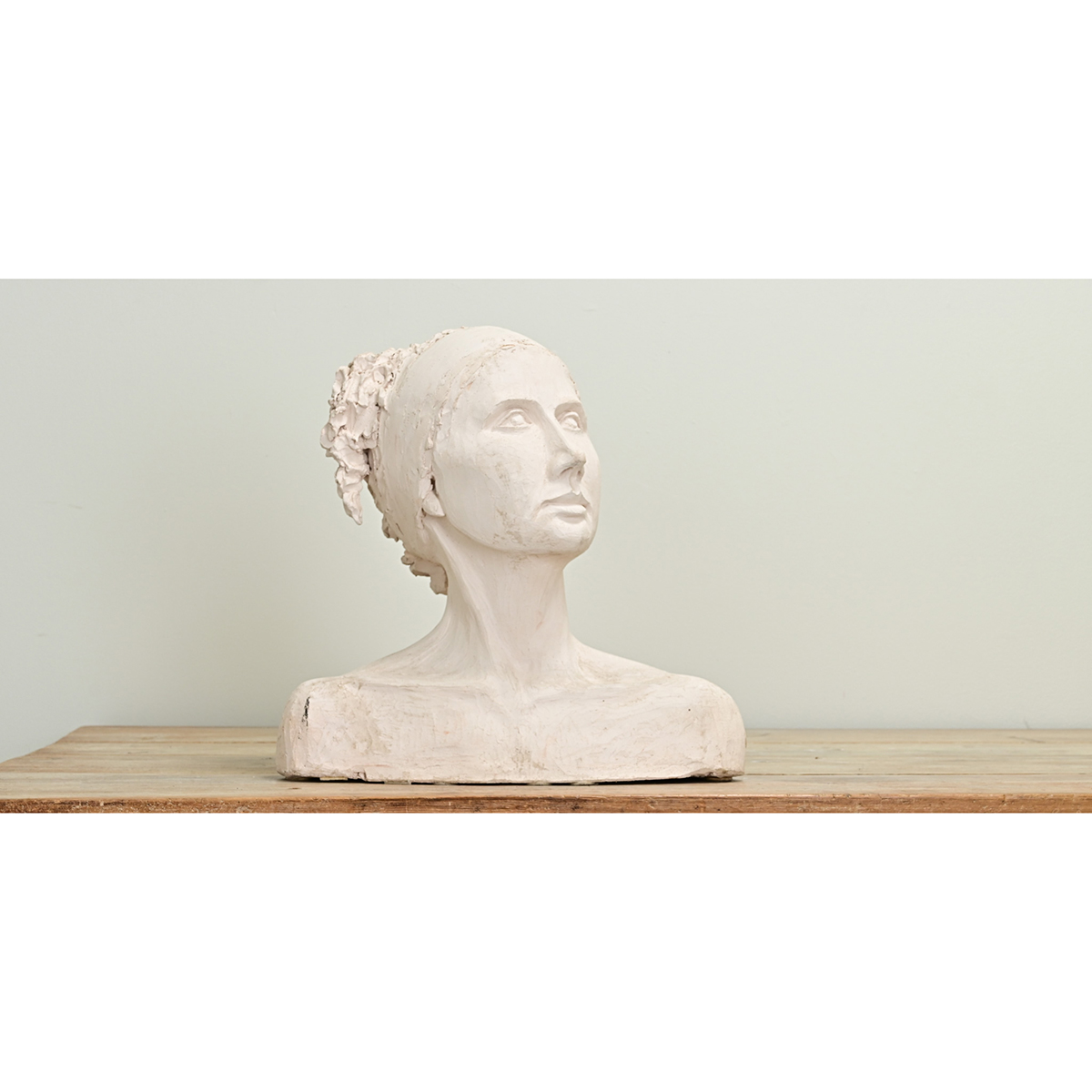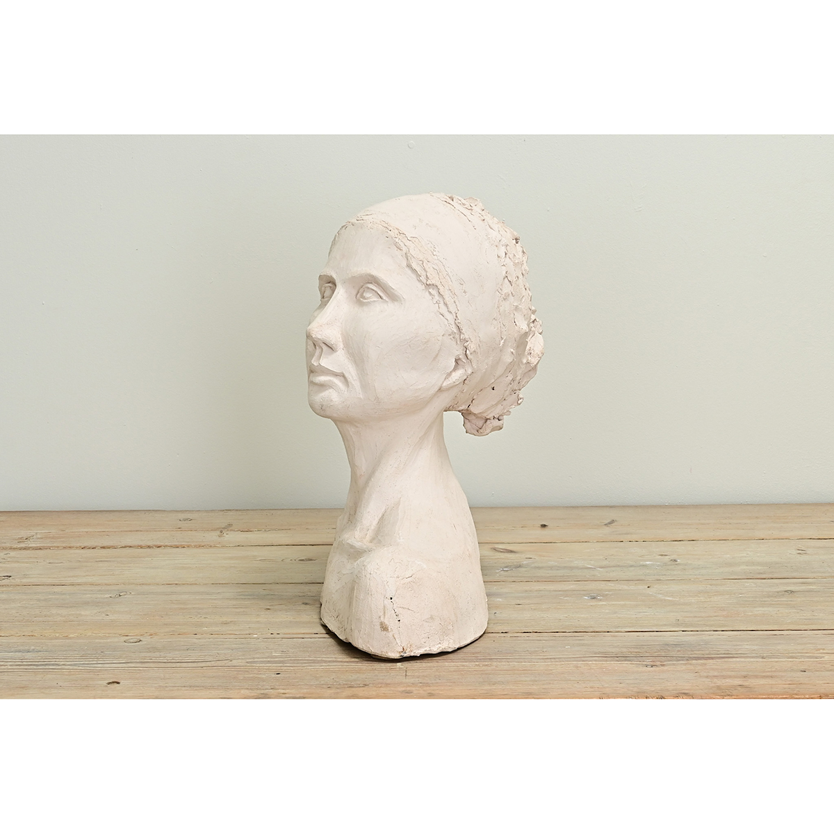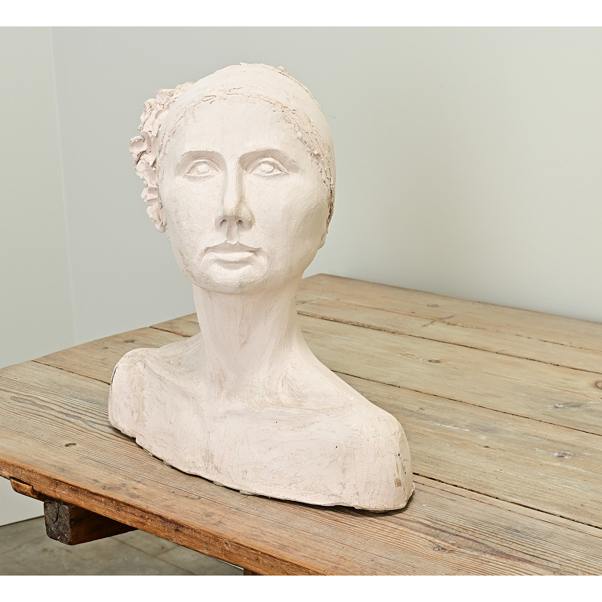 French vintage bust in larger-than-life scale and emotive likeness of an anonymous lady subject. Impressive craft and sensual technique can be found on this bust made of plaster, left raw and undecorated leaving the viewer to speculate about who she was and how she may have looked beyond the confident features captured here. Be sure to view all the details from every angle to see more.