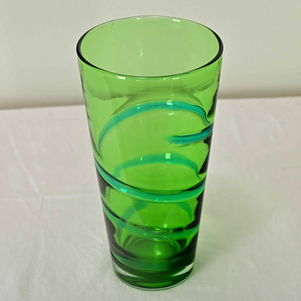 Wonderful emerald green glass conical vase with applied blue ribbon trail, designed by Barnaby Powell for Whitefriars England, circa 1935. It is easy to be mesmerized by the vase as a beautiful work of art glass, and will complement any bouquet. Please view the detailed images for a closer look.