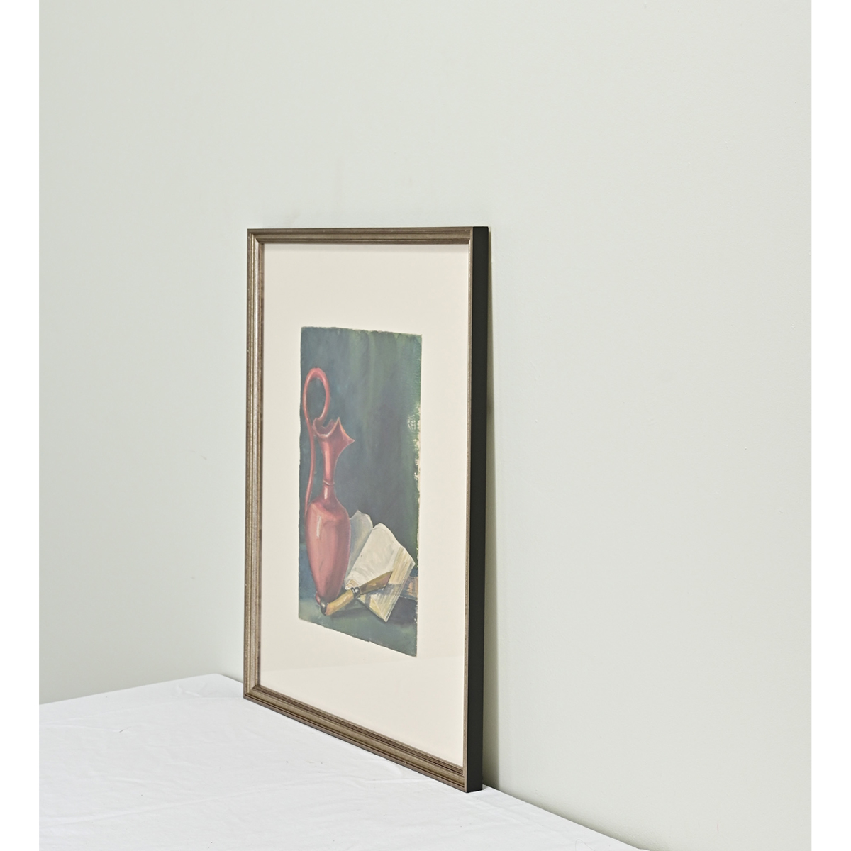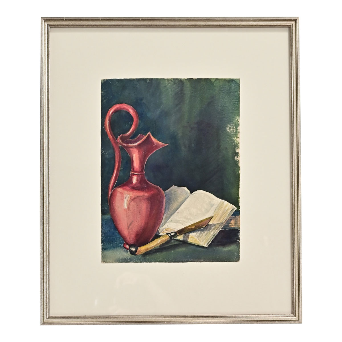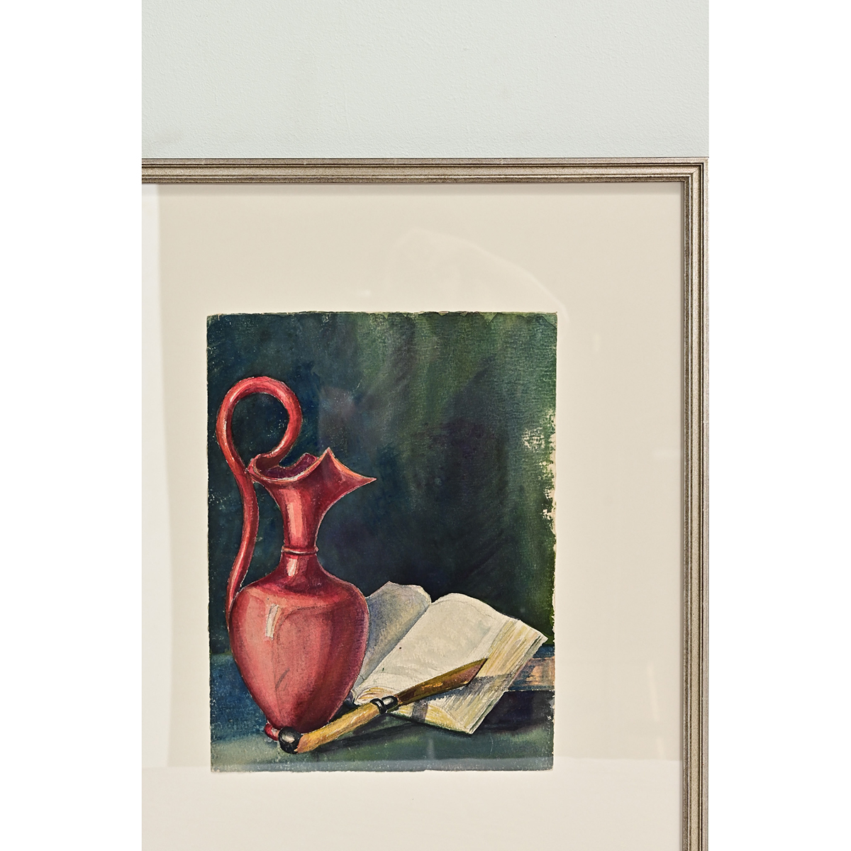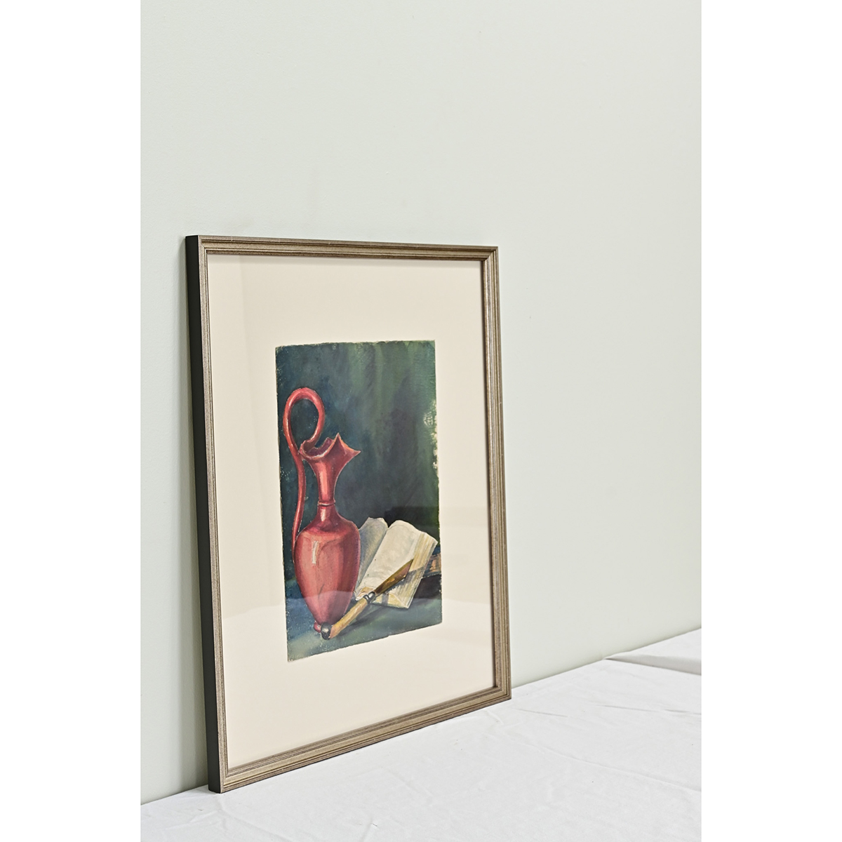 A vintage still life painting, watercolor on paper. This painting has recently been matted and framed in a silver finished frame. New conservation grade UV protective glass. Be sure to view the detailed images.